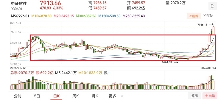 今天A股全面普涨,AI应用领涨众多科技板块,表现非常强势。其中中证软件指数(930601)目前大涨6.33%,走出一根实体大阳线,成功反包了昨天有阴线,再次转强的信号非常明显。软件也是AI应用的一个细分方向。可能有些朋友会觉得,AI应用从上周三开始发力上攻,到现在已经涨了好多天了,现在还能追吗?
