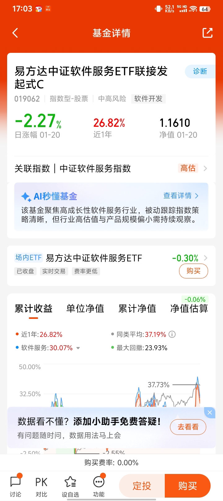 易方达中证软件服务ETF联接发起式C基金(019062)是布局软件应用领域的优质选择,其核心优势在于紧密跟踪软件产业趋势、管理费率低、投资门槛低,且当前行业处于政策红利与技术变革双重驱动的上升周期。