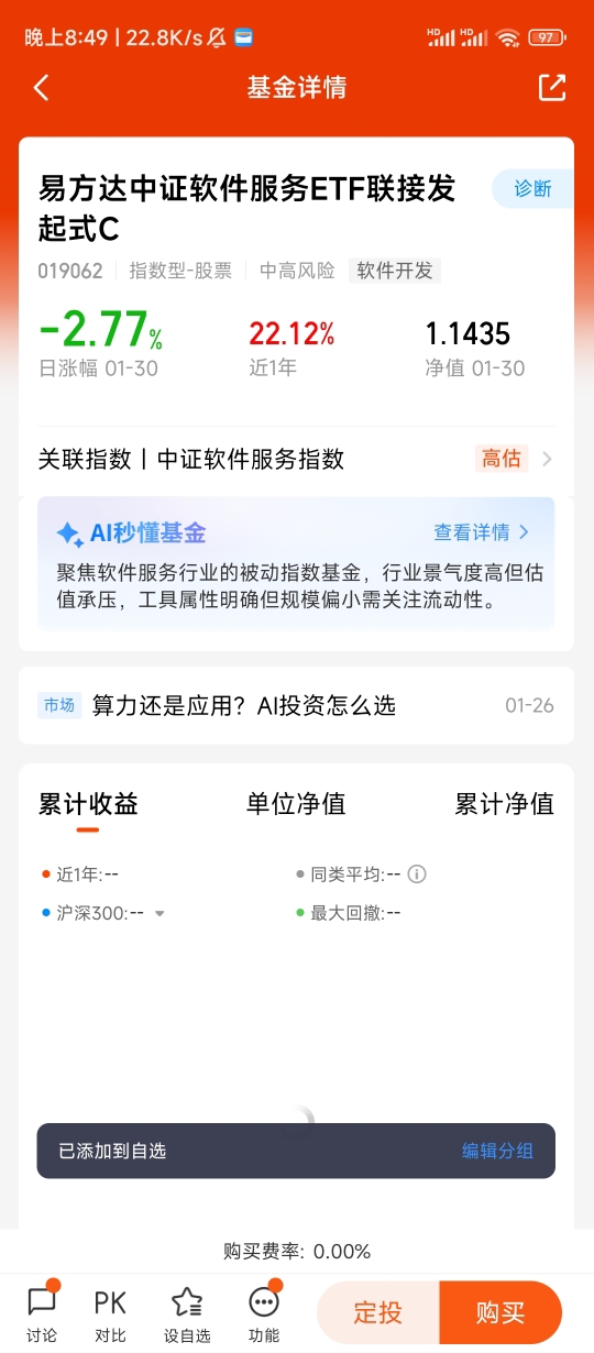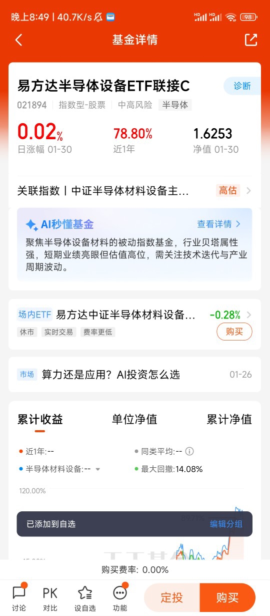 作为一个养基4年的投资者,我曾经踩过“追概念、乱选股”的坑。2024年跟风买过几只AI相关的主动基金,因为持仓分散、踩不准核心赛道,收益平平。后来才明白,普通投资者想把握AI应用机遇,选对工具比盲目选股更重要。易方达这只基金的优势太明显了:一是无需自己研究个股,指数编制规则已经帮我们筛选了优质标的,避免踩雷;二是C类份额零申购费,持有7天以上赎回费极低,长期定投成本划算;三是易方达作为头部基金公司,指数跟踪能力靠谱,能精准复刻板块行情,不用担心里跑输。