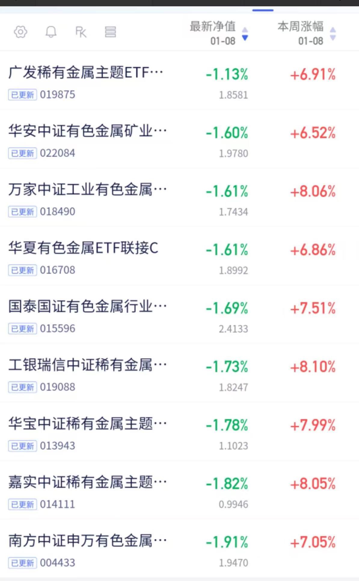 上周进了广发中证稀有金属ETF发起式联接C一周吃了7、8个点,是稀土含量比较高的