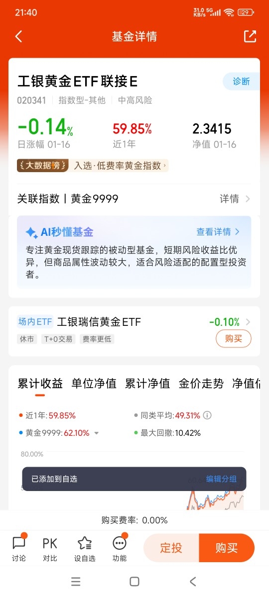 #2026你怎么看?#最近财经新闻挺热闹。金价一路向上,每盎司突破了4500美元的门槛,白银、铂金这些也跟着动。再看稀有金属那边,锂、钴的供给老是有点小插曲,价格也下不来。不少声音都说,稀贵金属的势头可能还会持续。这种环境下,手里拿着相关资产,心里感觉多了一层踏实。回头看看自己拿着的工$工银黄金ETF联接E$ ,一年多下来居然涨了接近60%,没想到黄金也能这么“冲”。费率是真低,管理费加托管费一年才0.2%,持有超过七天连赎回费都省了,适合没事就想倒腾几下的人。平时工作忙,没空盯盘,黄金这类资产反而让人省心——美联储降息周期里,实际利率往下走,黄金机会成本降低,加上全球央行都在囤金,趋势一时半会儿停不下来。