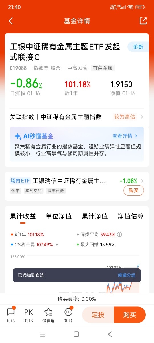 稀有金属这块,$工银中证稀有金属主题ETF发起式联接C$ 去年翻倍的表现确实亮眼。稀土、锂、钨这些材料,听起来离生活远,实则渗透在新能源、军工、航天这些高景气领域。供给端故事特别多:锂矿开采环保门槛提高,钴出口国动不动加税,库存一直紧巴巴的,价格易涨难跌。不过波动也比黄金大,所以只敢用闲钱慢慢定投,跌多了就多买点,涨猛了也不追。