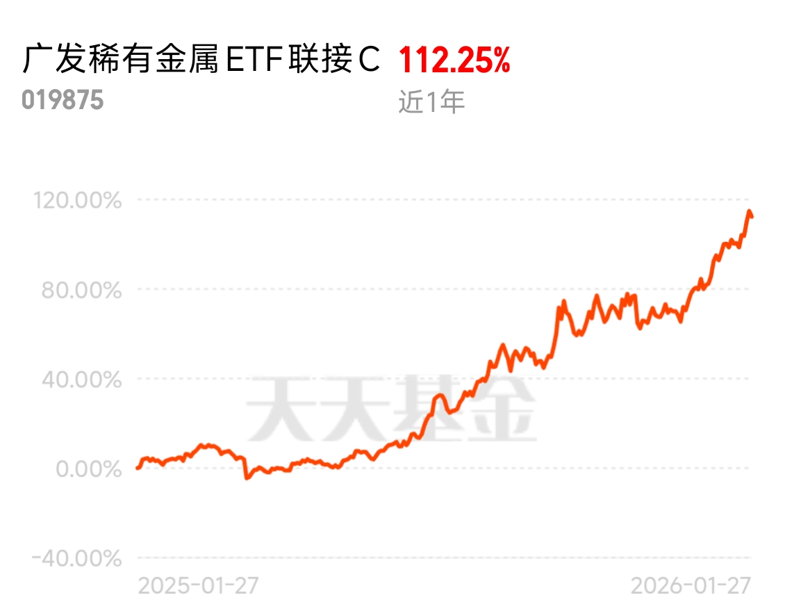 广发中证稀有金属ETF联接C我准续拿稳,近一年好歹112%,还有广发上海金也买了,况且我觉得稀有金属这波要从周期品变成战略资产了。还有以前看供需,现在看地缘政治和供应链安全。价值重估一旦开始,逻辑就不会短$广发稀有金属ETF联接C$