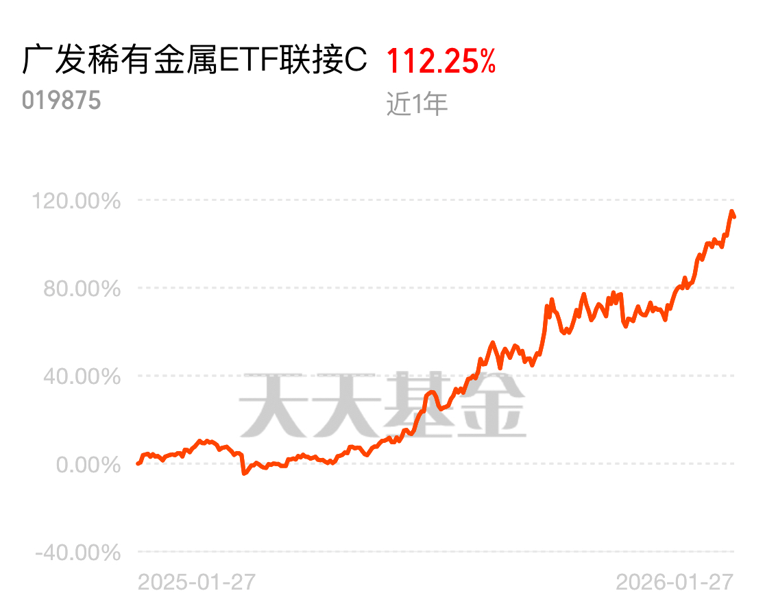 广发中证稀有金属ETF联接C我准续拿稳,近一年好歹112%,还有广发上海金也买了,况且我觉得稀有金属这波要从周期品变成战略资产了。还有以前看供需,现在看地缘政治和供应链安全。价值重估一旦开始,逻辑就不会短$广发稀有金属ETF联接C$