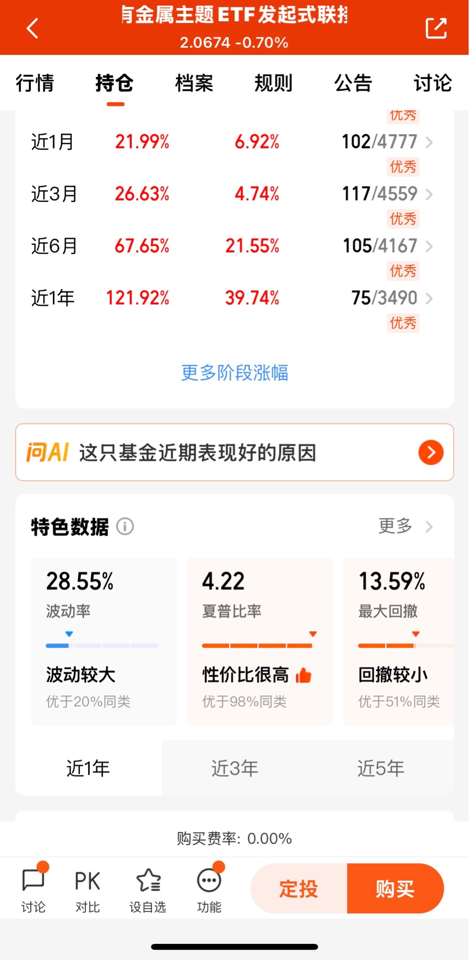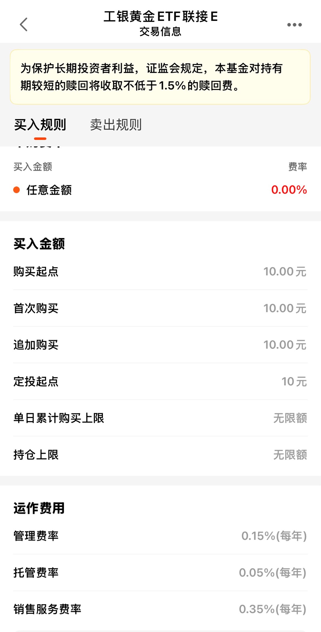 它的优势还在于入选低费率黄金指数基金,其管理费、托管费、销售服务费合计只有0.55%/年,而且持有7天也是免赎回费,且10元起购,对于害怕黄金波动大的朋友们,其实可以小量投资,或者说通过定投的方式进入;