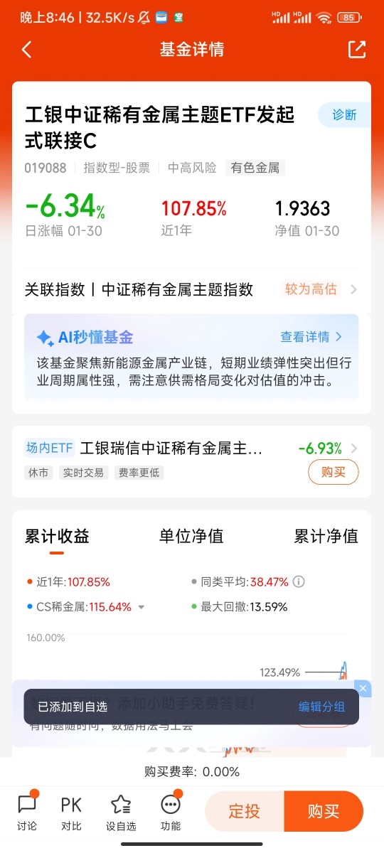 那普通投资者该怎么把握2026年的机会呢?其实不用自己去猜哪个品种会涨,像工银中证稀有金属主题ETF发起式联接C这样的产品,就把黄金、白银、稀土这些稀贵金属都打包在了一起,相当于一键布局整个板块。这样做的好处很明显:一来不用纠结选哪个品种,分散了风险;二来门槛低,几百块就能参与,不用像买实物黄金那样需要大笔资金;三来专业团队打理,比自己瞎琢磨靠谱多了,特别适合不懂专业分析、又想分享稀贵金属行情的普通人。