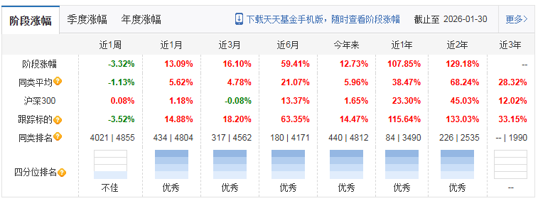工银中证稀有金属主题ETF发起式联接C基金自成立以来表现优异。截至2026年1月底,基金成立以来净值增长约102.11%,近一年涨幅达116.95%,近半年涨幅64.14%,近三个月涨幅31.96%。这一表现远超沪深300指数(近一年涨幅25.90%)和同类平均基金。