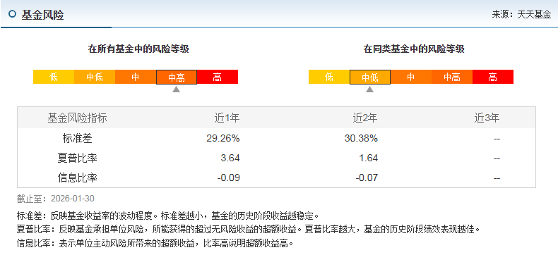 截至2026年1月底,该基金规模约为1.76亿元,较2025年9月底的0.82亿元有显著增长。基金资产配置中,目标ETF占90.45%,银行存款占7.44%,股票占0.23%,其他资产占1.88%。基金的高波动性特征明显,但风险调整后收益(夏普比率)高达3.48,优于同类产品。