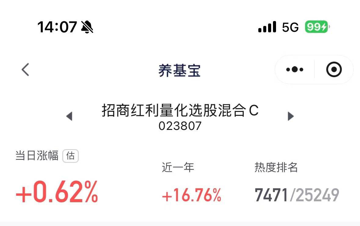 现在量化基金越来越受追捧,红利策略更是逆势走强,招商红利量化选股混合 C 太争气了!近 3 月涨了 6.84%,近三个月红利量化大幅跑赢,超额收益近 10%,今日估值还飘红,当成底仓配置心里踏实得很。$招商红利量化选股混合C$