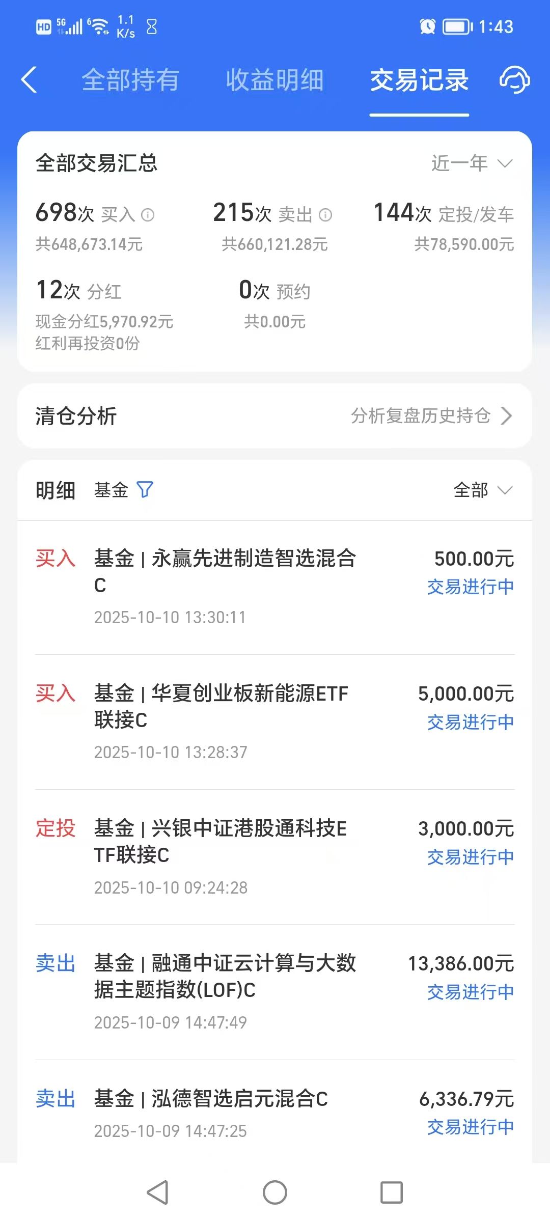 恒生科技指数走得也真是没谁了,10月2号大阳线反弹一天后就是连续下行,今天已经是第五天回调再次回到20天线附近,这也是9月中旬的平台位置,结合已经连续回调五天了,我认为继续回落的概率是比较低的,倒车接人的概率比较大。今天加仓兴银中证港股通科技ETF联接C 3000元,这个品种跟踪的是中证港股通科技港元指数,昨天还有0.23%的收益比恒生科技还要稳,再加上科技是今年行情的大型主线,随着存储芯片涨价、云计算涨价等利好层出不同我继续看好,趁着国内科技因为两融规则出现回调影响到港股,恒生科技回调至20天线,对兴银港股通科技来说也仅是一天回撤而已很是划算,现在倒车接人了当然继续把握!