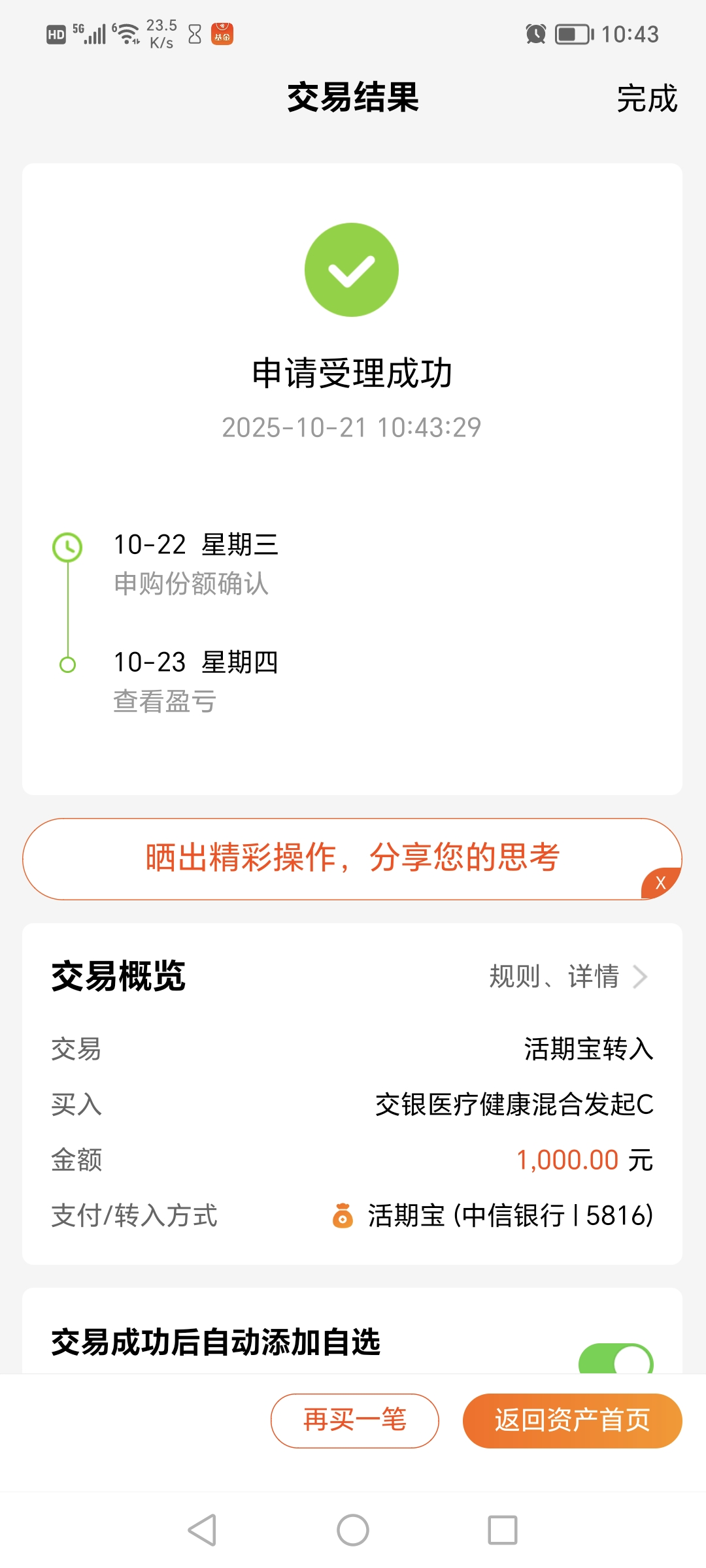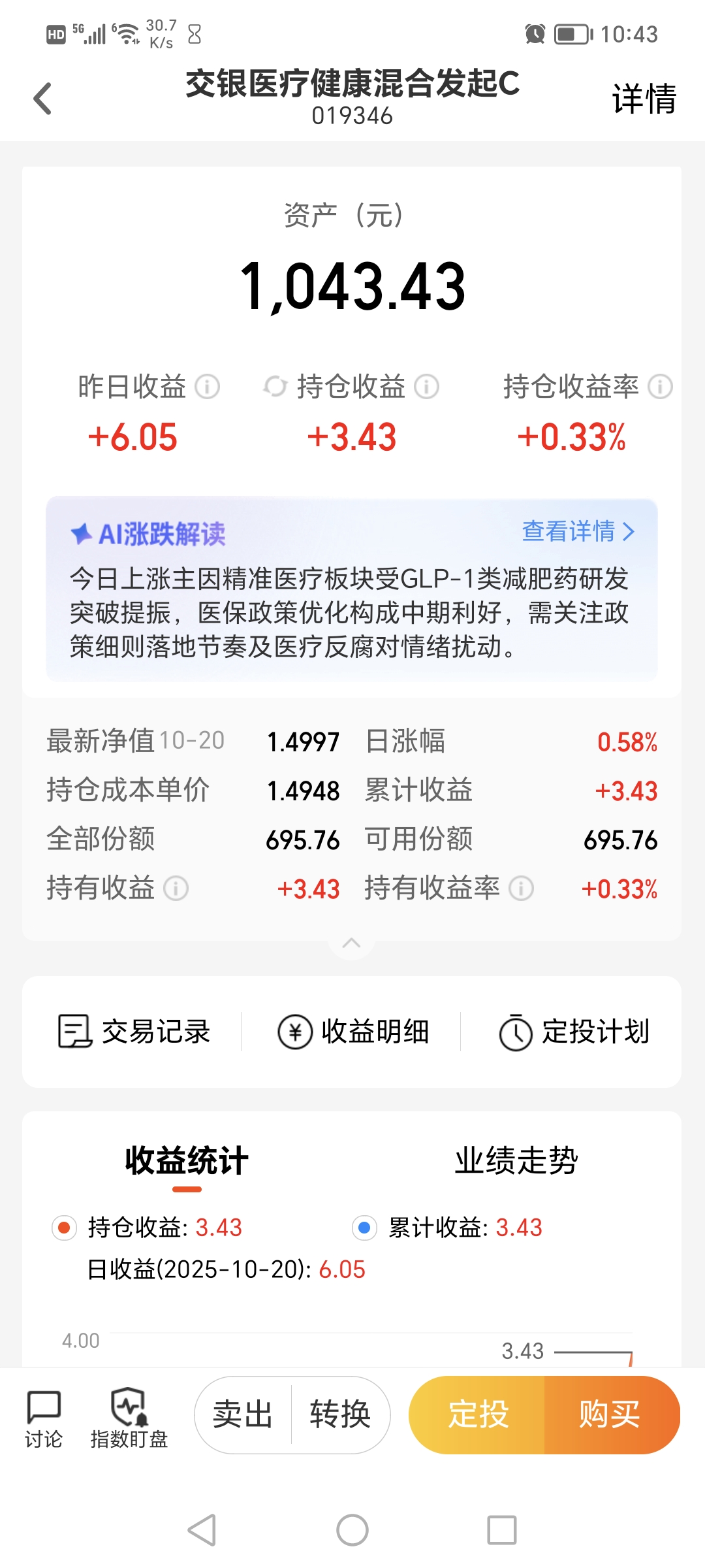 $交银医疗健康混合发起C(OTCFUND|019346)$今天加仓1000元。