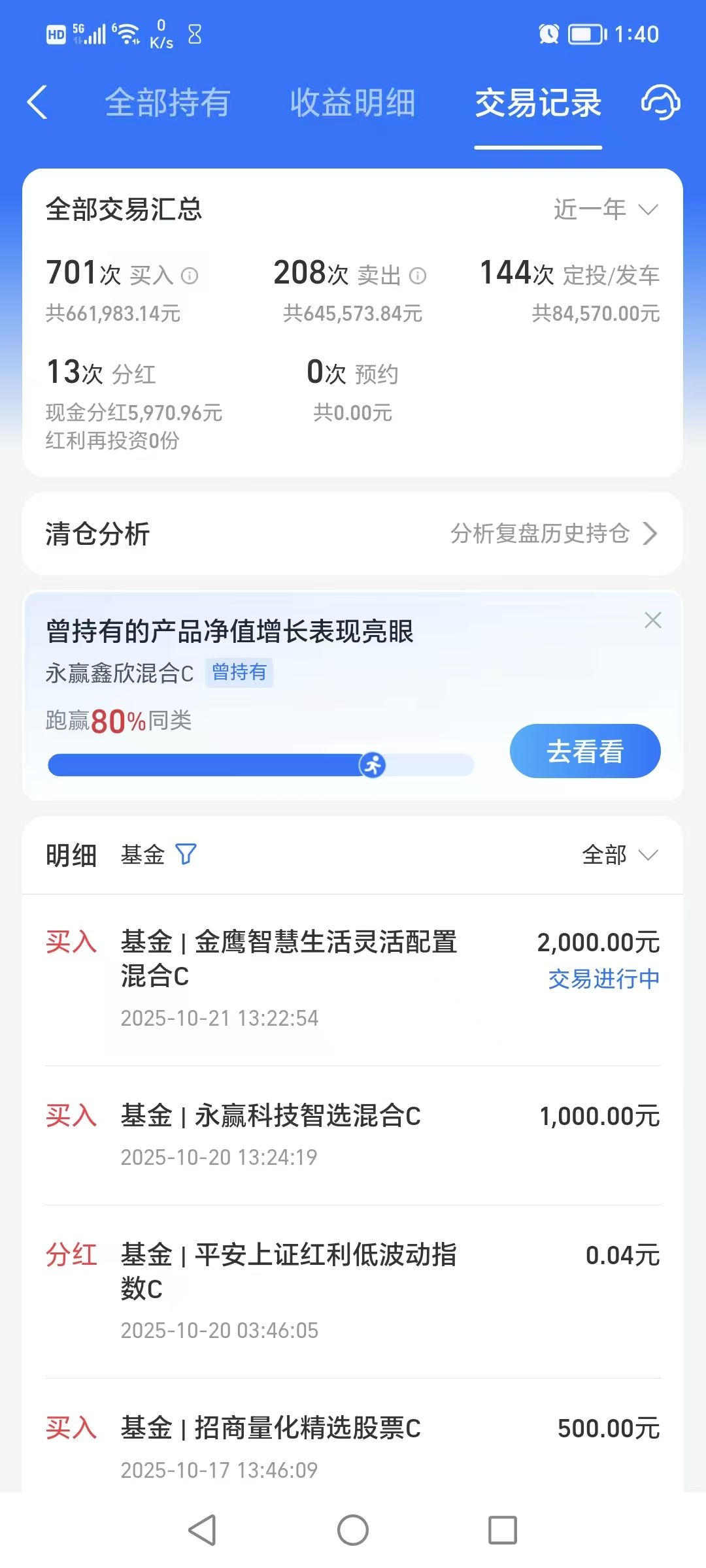 今天加仓交银医疗健康混合发起C 1000元,这个品种在创新药方向比较大,华鑫证券-医药行业周报(251019)表现,国内落地多个创新药的对外授权项目,包括维立志博(BDCA2/TACI双抗,临床前)、翰森制药(CDH17ADC,I期)、奥赛康(VEGF/ANG-2,II期)、海和药物(PI3K抑制剂,NDA)等。虽然缺少首付款超过2亿美元以上的重磅交易,但创新药对外授权的节奏已恢复。创新药作为医药板块的龙头先锋,在医药箱底位置是最有可能率先跑出来的,上周五行情冰点时已经进场布局了,现在成交量这么少,市场依然处于低迷且等待消息刺激的状态,我当然是继续看好啦,如果出现大单BD再追,性价比就没现在高了。