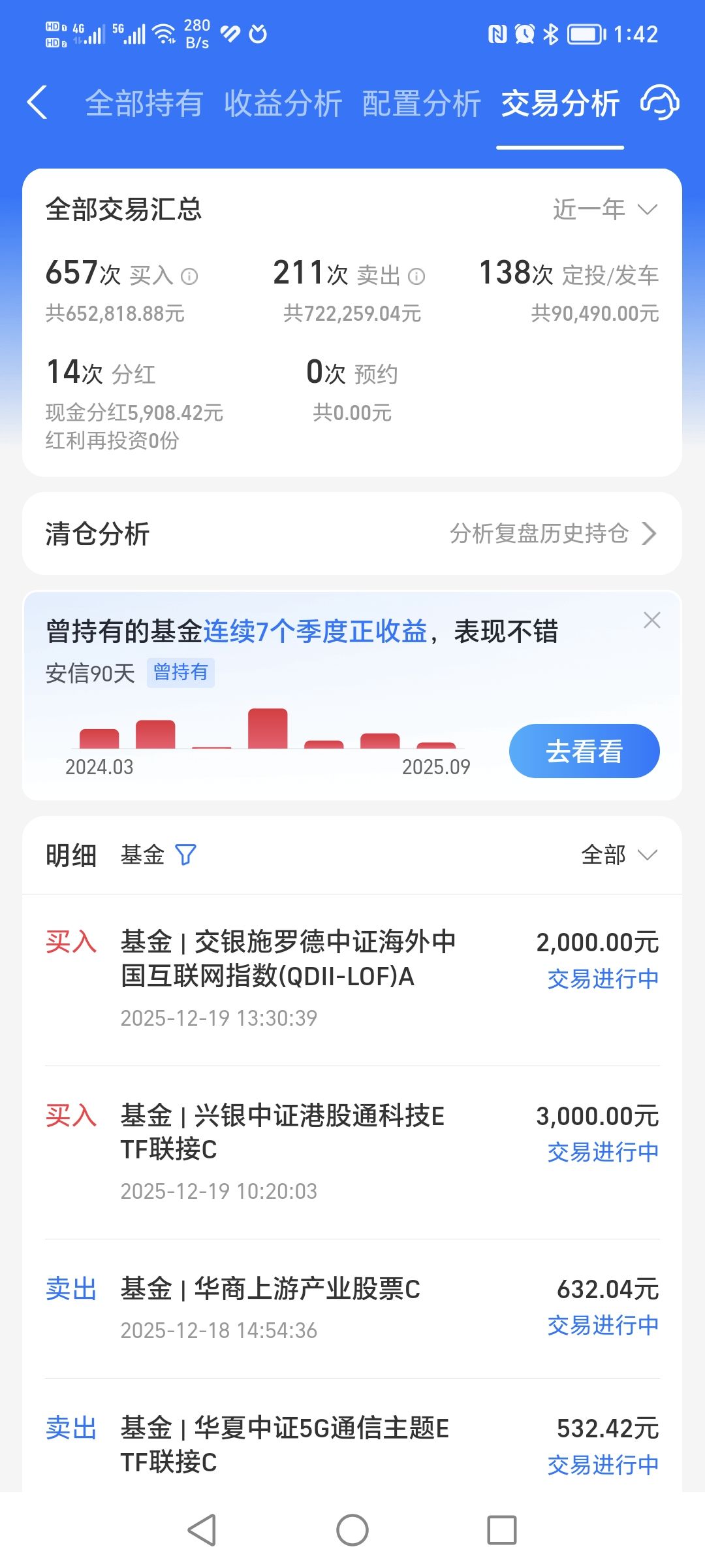 隔夜美光财报全面超预期,存储高景气度再获验证,再度带领纳指大幅走高,昨天我投纳指节奏还是可以的,但纳指是限购太严重了,要把握海外科技题材,还得看交银中证海外中国互联网指数(LOF)A。海外互联网近期受人工智能泡沫论影响近期出现比较大的回撤,可各类财务数据均显示人工智能业务增幅强劲,是有业绩支撑的估值修复,并不是纯概念的炒作,这样的回撤完全是悲观过度的结果。今天加仓加仓交银中证海外中国互联网指数(LOF)A 2000元,这个品种对标中证海外中国互联网指数,既然人工智能业务并非泡沫,商业应用落地的预期是明显的,比如上周的豆包手机,就是人工智能应用的新尝试,我觉得这类技术应用将会持续爆发,在商业变现方面,还是互联网大厂强,经过三个月的估值挤压,吸引力明显增强,今天人工智能重新走强,我当然继续看好。