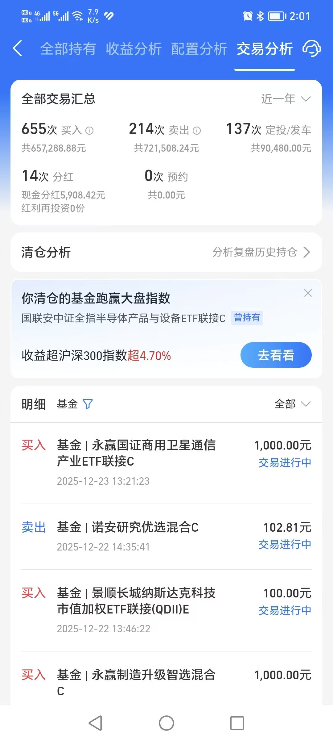 近期商业航天很火,获得不少资金流入。昨天特斯拉创下历史新高,上涨逻辑是是马斯克在特斯拉股东大会上说的考虑让特斯拉股东有机会投资SpaceX,spaceX目前市场预期是1.5万亿美元,国内同类产业也在火速追赶。今天商业航天强势休整,正我觉得是一个倒车接人的机会,今天加仓永赢国证商用卫星通信产业ETF联接C 1000元。这个品种精准跟踪国证商用卫星通信产业指数,深度聚焦卫星赛道全产业链覆盖,精准卡位商业航天+卫星通信的主线,是商业航天主题比较贴合的指数基金。我认为国内商业航天是从0到1的质变,明年的行情景气度也很高,休整期给了很不错的机会,我继续上车试试。