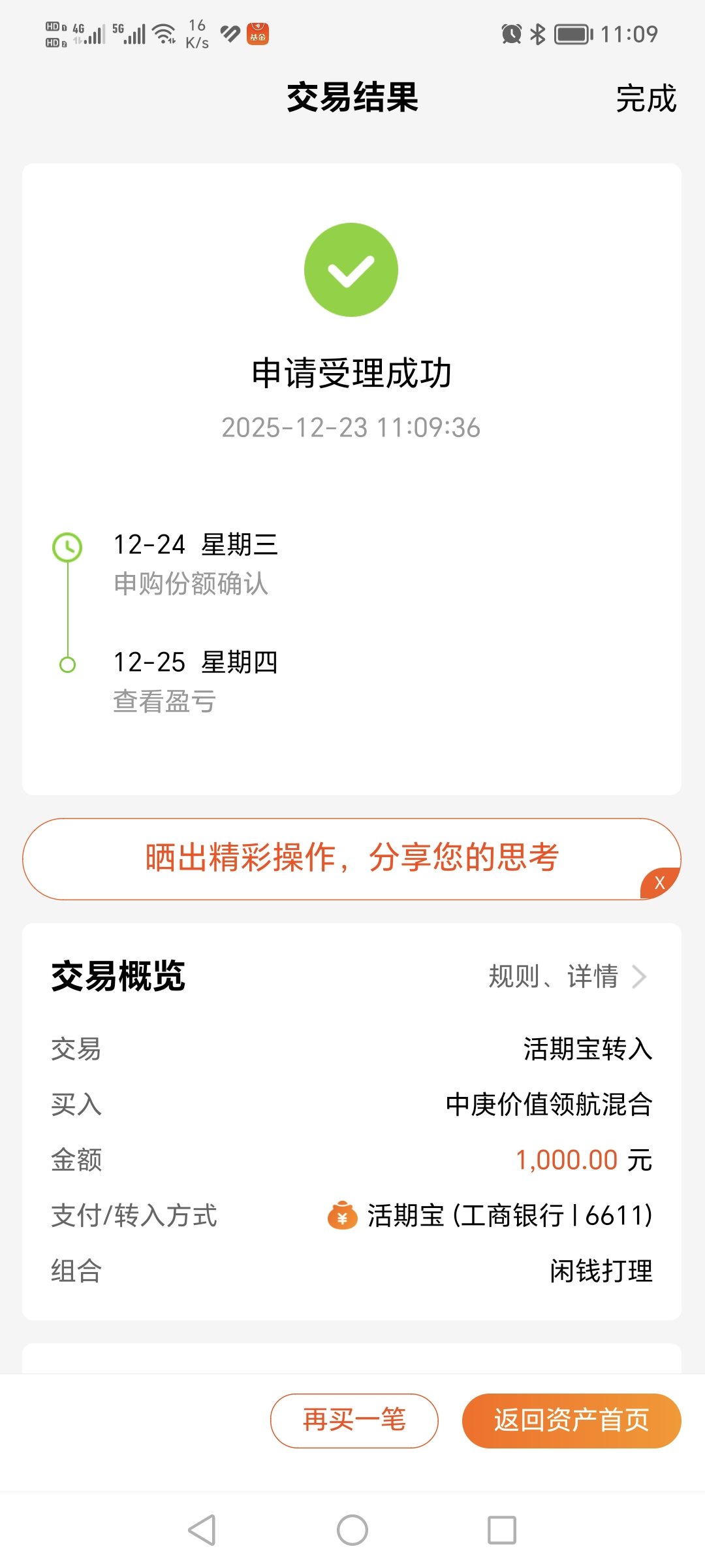 $中庚价值领航混合(OTCFUND|006551)$今天加仓1000元。