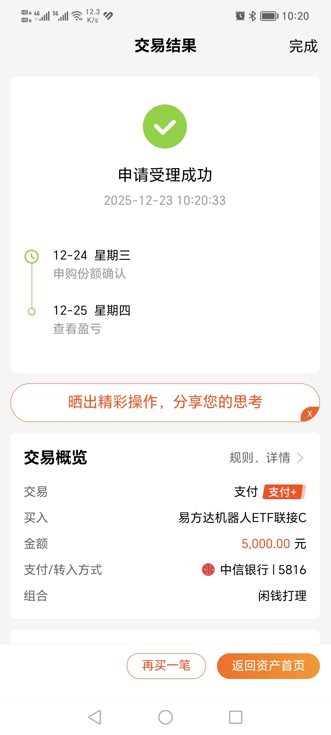 $易方达机器人ETF联接C(OTCFUND|020973)$今天加仓5000元。