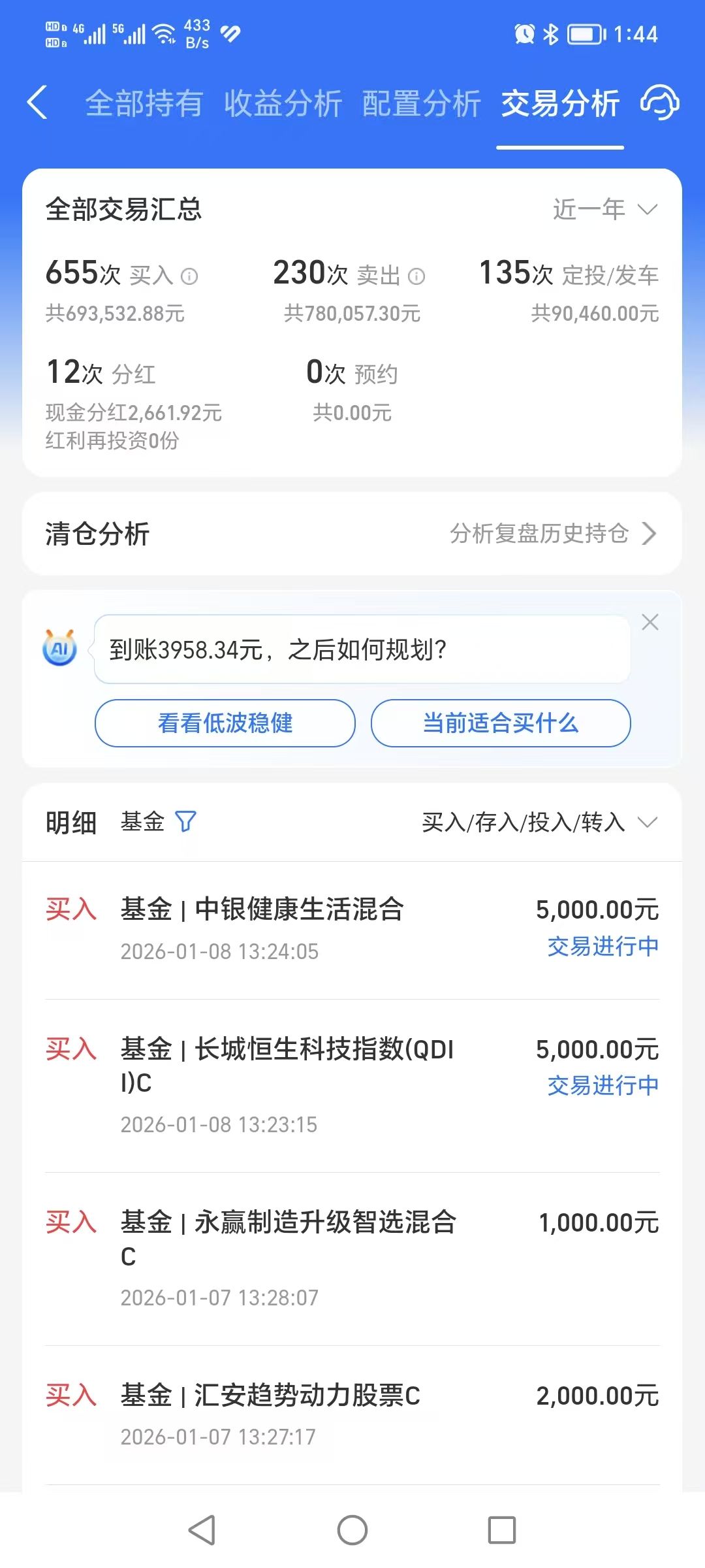 今天加仓浦银安盛医疗创新混合C 1000元,这个品种这两天我一直在看,从目前业绩来看,它主要投向A股、港股创新药,走势明显强于医药或医疗指数,“脑机接口”估计含量也不少。节后市场成交量明显放大已经有明显异动,本来看是超跌反弹,现在出现超预期的行情表现,我觉得就是一个转势拐点,要信就要早信,我还是跟着主力的节奏一起参与好了。