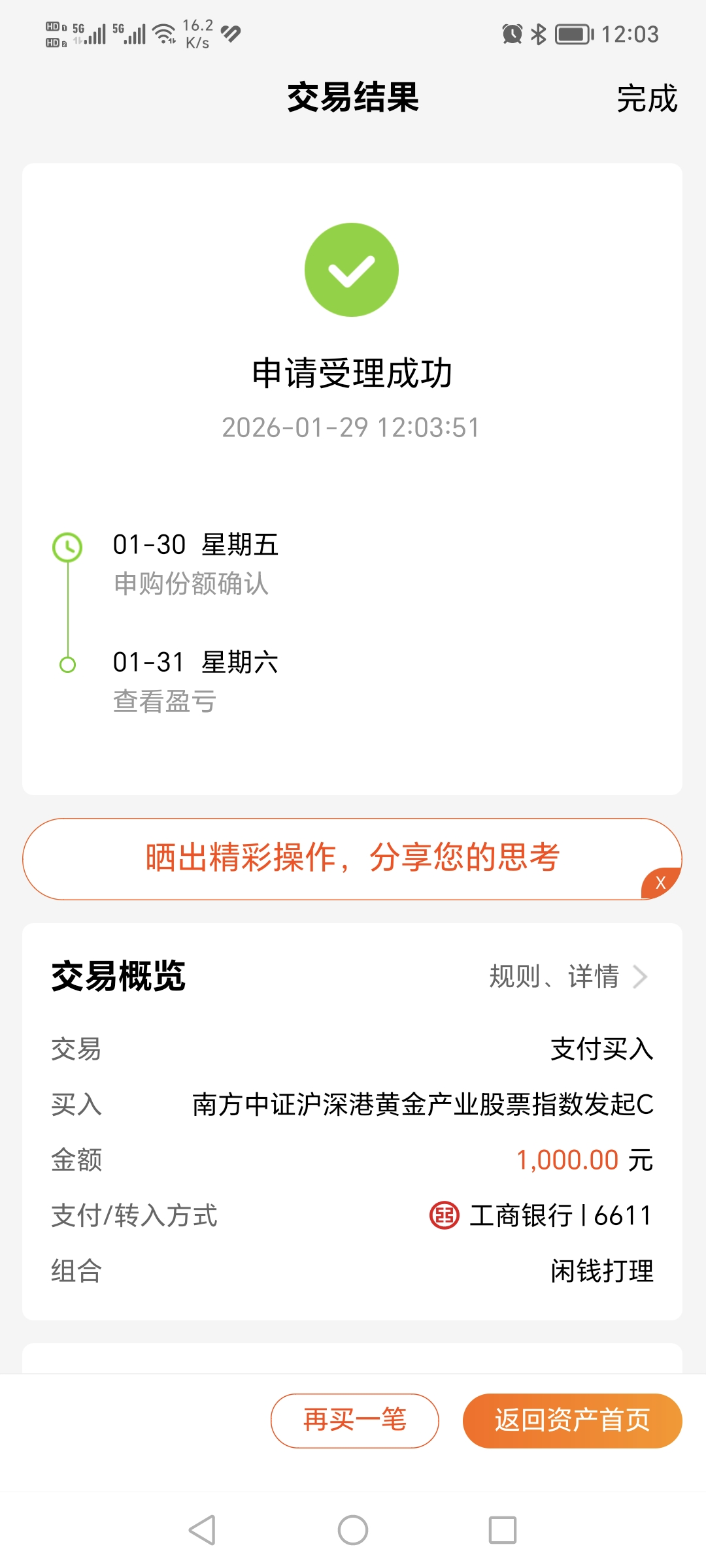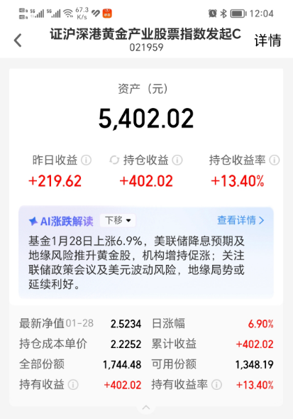 $南方中证沪深港黄金产业股票指数发起C(OTCFUND|021959)$今天加仓1000元。