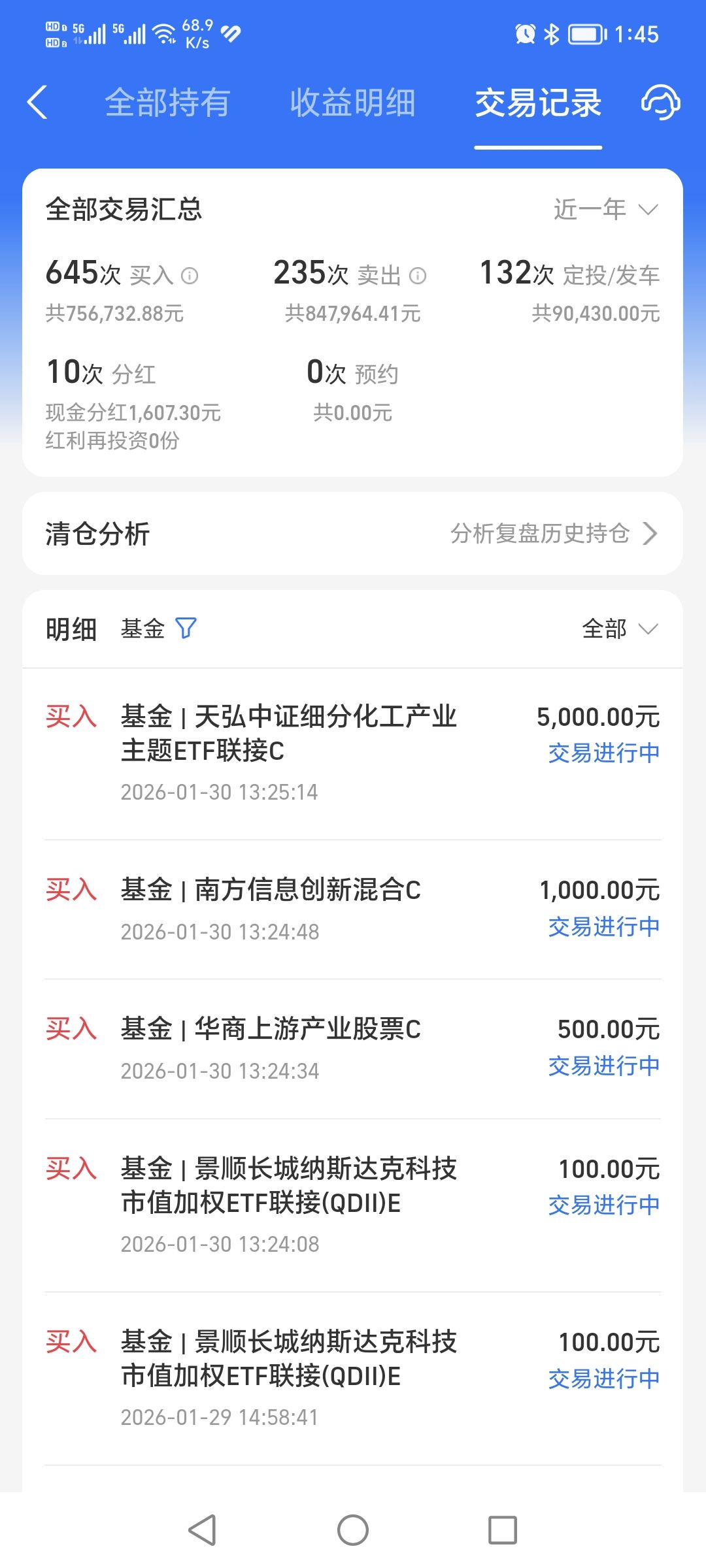 今天资源类题材巨震,说说我的想法,我认为连续上行后必然有震荡,毕竟短线获利盘太多,主力就这样带大家吃香喝辣不现实,不坚定的筹码是不能的。现阶段最重要的是看走势,看逻辑,还要双重验证。虽然黄金今天巨震,但整个1月的涨幅依然巨大,甚至本周还是正收益,这就不能认为行情已经结束,即通胀预期的苗头已经生根发芽了。如果商品资源价格不可逆,我认为可以从还没有明确启动的国际定价商品入手,有色资源涨太多了性价比不高,我会选择化工方向。今天加仓天弘中证细分化工产业主题ETF联接C 5000元,这个品种跟踪的是细分化工行业指数,直接覆盖各类型的化工企业,化工周期也有一个规律,就是涨价风口出现后越是高市盈的越有潜力,因为业绩是将来的未反映到行业上,反倒是化工行业变成低市盈就注意风险。今天化工行业在没有持续上涨的情况下被黄金巨震影响出现回调,这不就是一个很好的机会吗?倒车接人的机会太验证得了,今天我必须再次跟上。