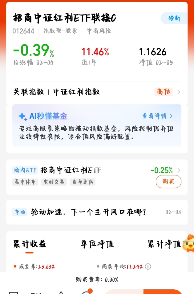 近期市场震荡反复,成长板块波动大,红利策略成避险优选。$招商中证红利ETF联接C$ 聚焦高股息、现金流稳健龙头,回撤小、走势稳,防御属性拉满。指数估值低、分红稳定,资金持续净流入,震荡市抗跌又能赚股息。持仓分散均衡,覆盖银行、公用事业等顺周期板块,行情回暖也能跟涨,是当前底仓配置的优质选择,拿得稳、体验好。