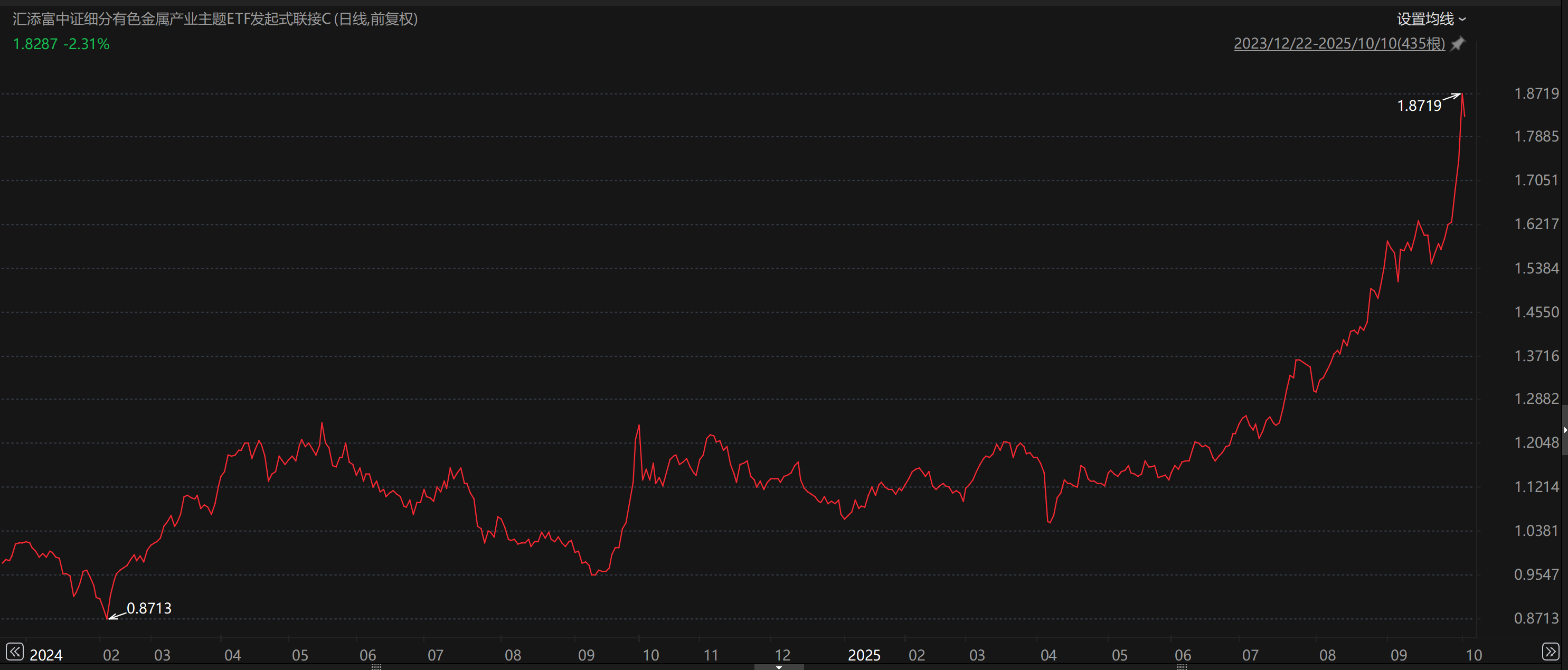 $汇添富中证细分有色金属产业主题ETF发起式联接C$(019165)作为跟踪该指数的便捷工具,为普通投资者提供了布局有色金属板块的一站式解决方案。自成立以来,该基金表现出良好的跟踪效果,截至10月10日,基金近期业绩表现尤为亮眼,近一周涨幅达4.89%,近一月涨幅16.33%,近三月涨幅48.81%,近六月涨幅66.06%,今年以来涨幅已达71.07%,近一年涨幅58.41%,表现优异。从费率角度看,该基金C类份额日常费用较低,且持有满7天即可免赎回费,为投资者提供了低成本、高灵活度的投资选择。在当前有色金属板块分化加剧的背景下,选择这样一个成分结构合理、集中度适中、跟踪误差可控的指数基金,有助于投资者把握有色金属行业的结构性机会,规避单一金属价格波动风险,分享资源行业在新时代下的投资机遇。#全球市场深夜暴跌!纳指重挫超3%#