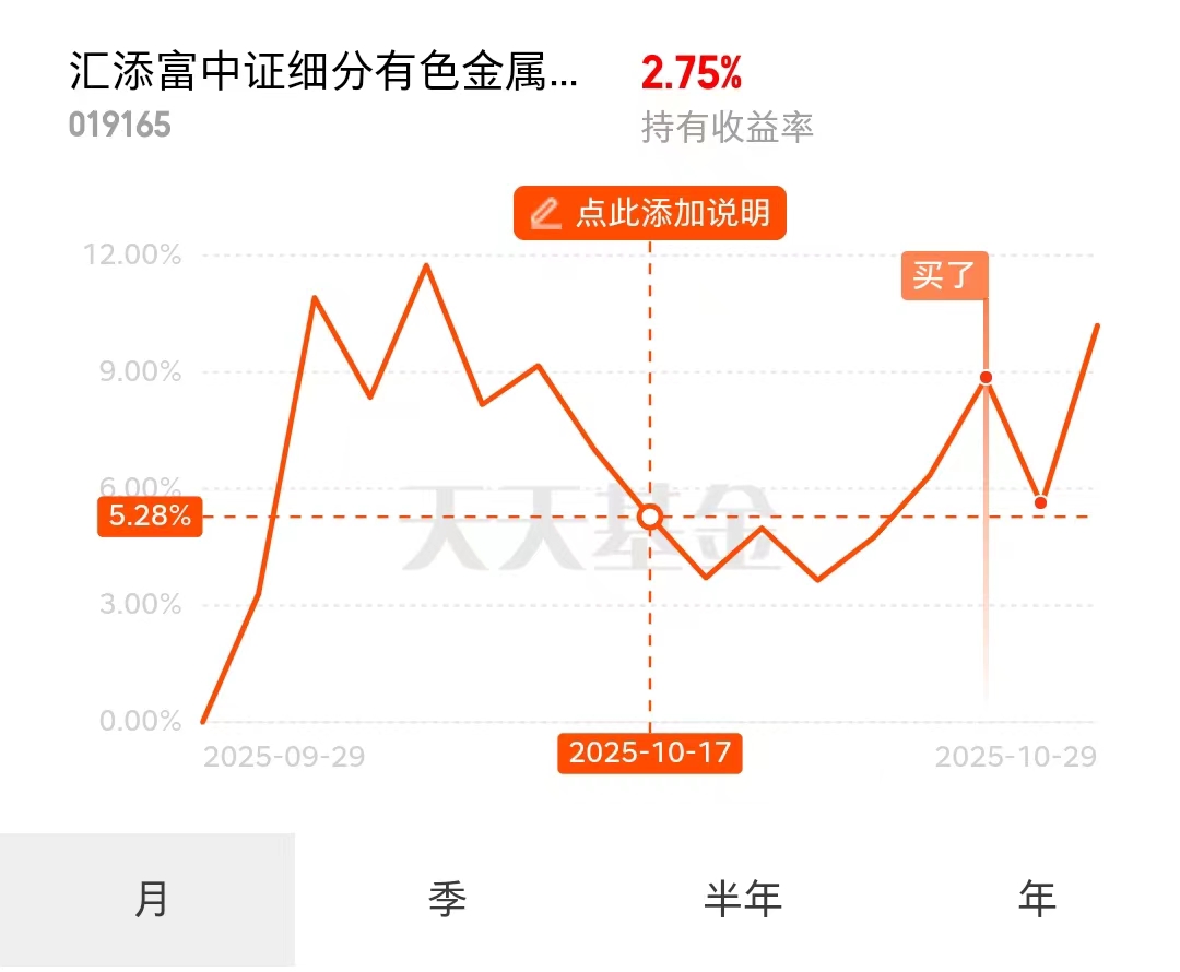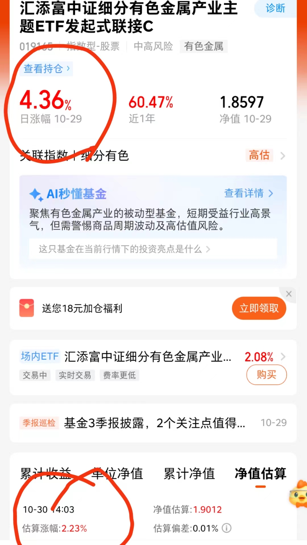 昨天沪指创新高,今天股市行情整体分化,但是沪指还在继续上涨,看来很有可能再创新高了,有色金属板块紧随其后,昨天猛涨反弹,今天继续上涨,我持仓的$汇添富中证细分有色金属产业主题ETF发起式联接C(OTCFUND|019165)$,昨天大涨4.36%,今年盘中估值继续上涨,涨幅拉升,刚刚我看已经涨超2个点啦,我又可以继续吃肉啦。