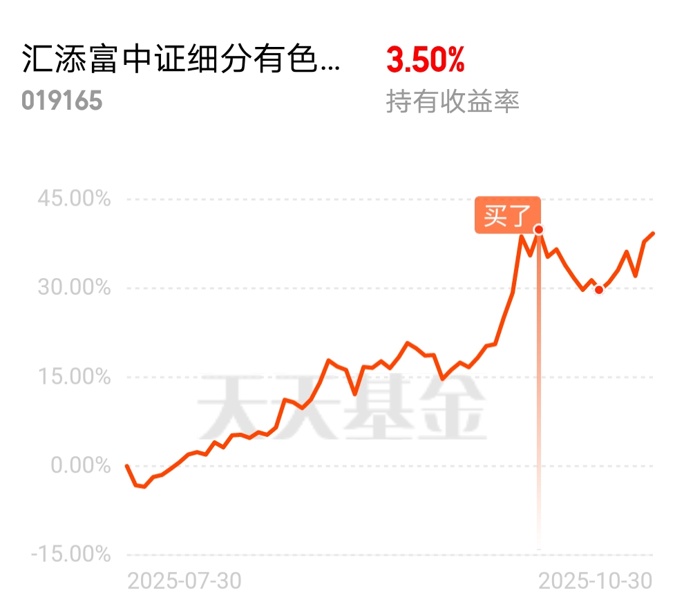 $汇添富中证细分有色金属产业主题ETF发起式联接C$ 这只基金更聚焦于“铜”和“金”,两者的含量就近50%,持仓集中度高弹性更大。今天回调继续加