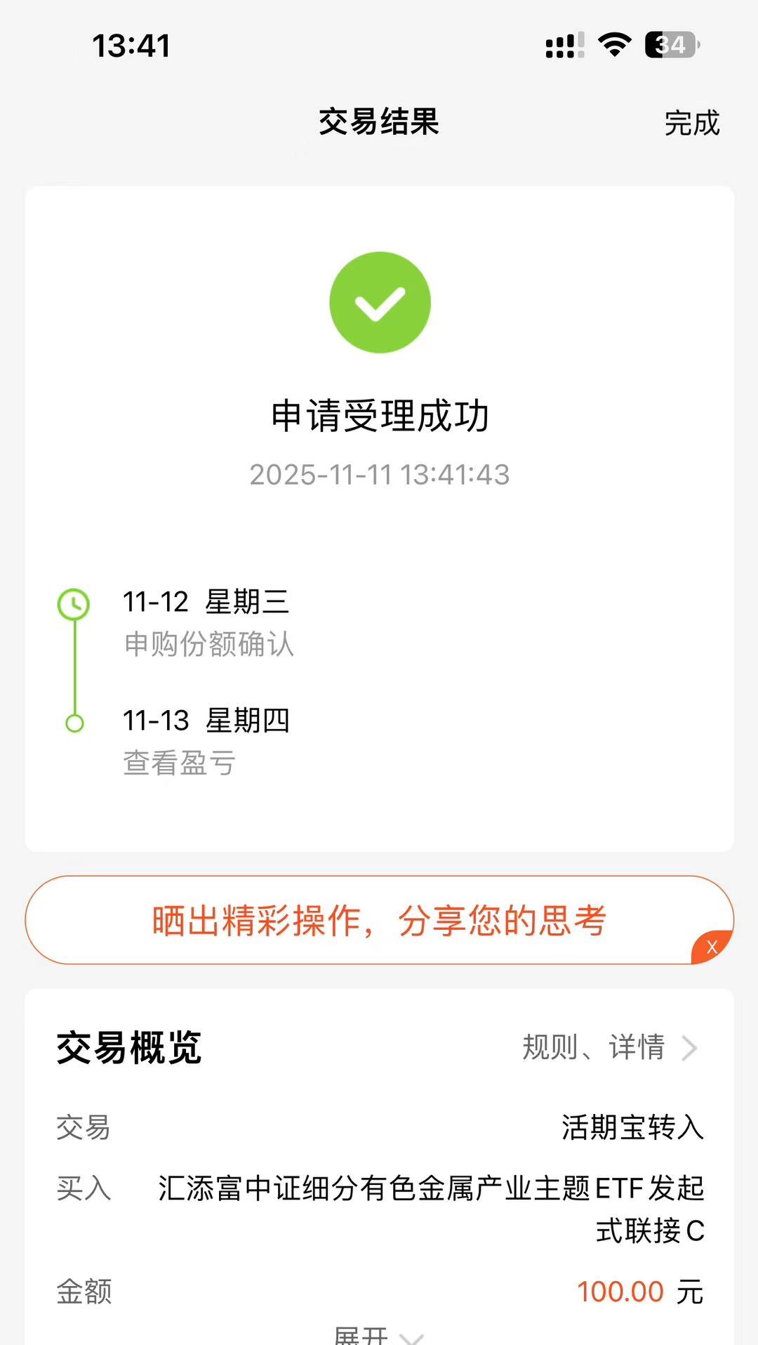 最近市场波动加大,我开始重新关注有色金属板块,特别是汇添富中证细分有色金属产业主题ETF联接C。它有一个突出的亮点,就是含铜量特别高,铜权重高达30%,黄金14%,都远高于同类指数,可谓“铜金双驱”,既能跟上新能源、电力设备的产业节奏,又具备黄金的避险属性。从结构上看,指数成分股集中度适中,前十大龙头包括紫金矿业、北方稀土、洛阳钼业、华友钴业、中国铝业等,全面覆盖铜、稀土、锂、铝等核心领域,行业代表性强。近一周的表现也明显领先同类产品,说明市场对有色主线的关注度正在升温。中期来看,全球供应链重构、美元信用稀释背景下,金属的金融属性和战略价值双双提升。供给端受限、需求稳中有升,估值仍具吸引力。趁着这波调整,我小幅加仓100元试水,期待有色在下一轮周期中继续发光发热。
