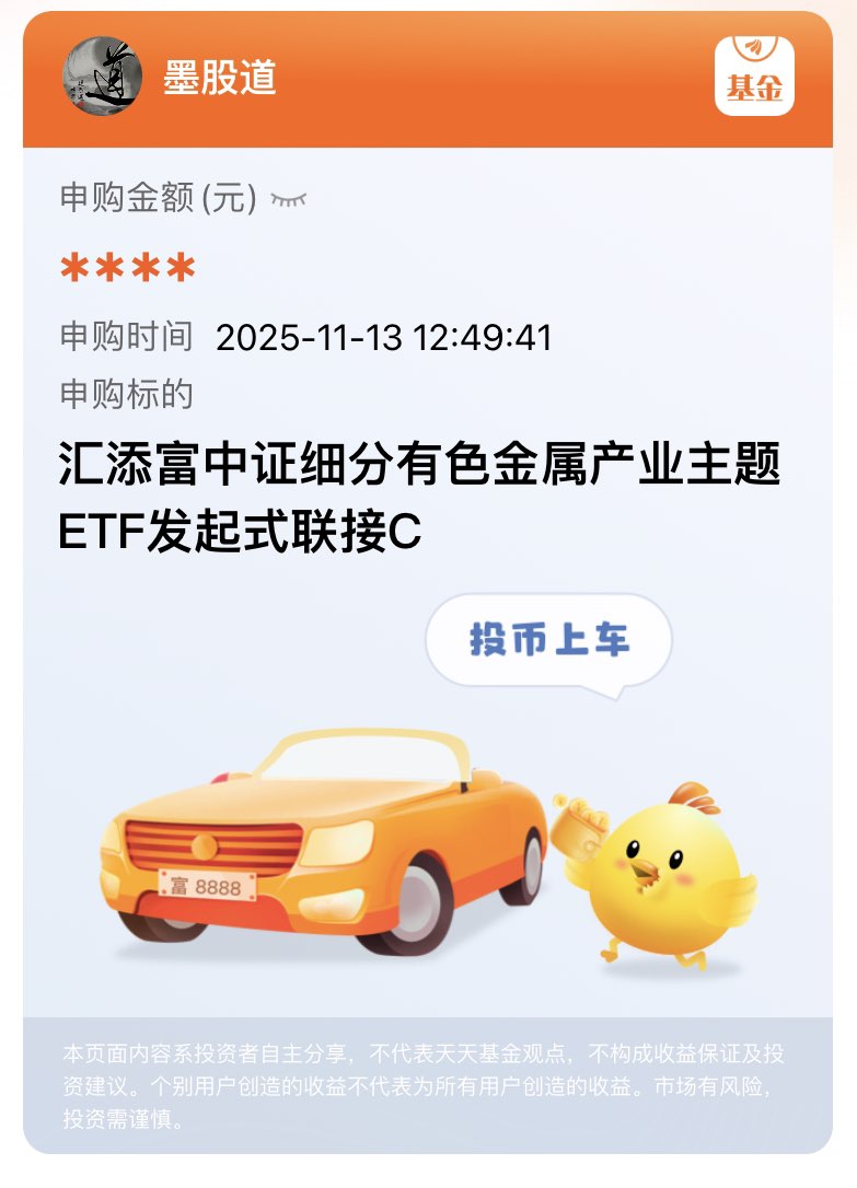 铜矿资本开支节奏慢、电解铝产能有国内天花板限制,加上地产降速放缓,叠加新质生产力带来新需求,有色板块整体趋势向好。$汇添富中证细分有色金属产业主题ETF发起式联接C(OTCFUND|019165)$亮点很突出,含铜量高达 30%、黄金占比 14%,远高于同类指数,“铜金双驱” 的配置既紧跟新能源、电力设备的产业节奏,又具备黄金的避险属性。这只基金业绩十分出色,近三个月上涨 32.88%、近六个月上涨 58.76%,我现在跟着上车~