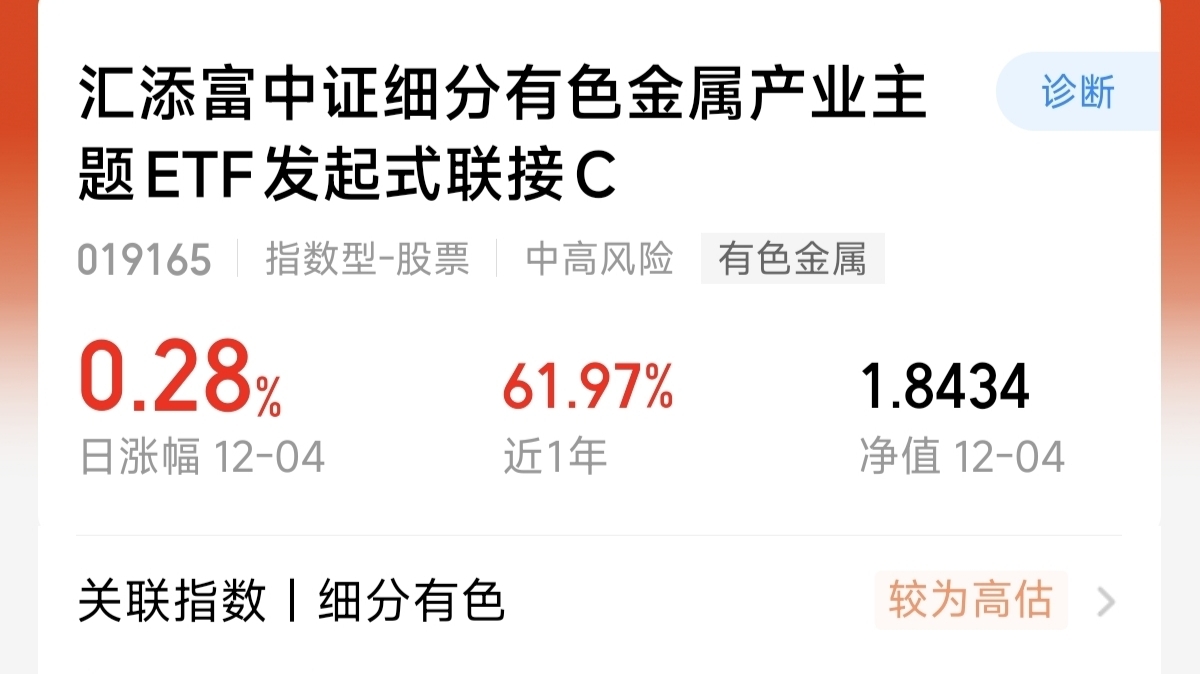 我持有的$汇添富中证细分有色金属产业主题ETF发起式联接C$ 这只聚焦有色金属产业的指数基金。紧密跟踪中证细分有色金属指数,其指数成分股中铜含量达33%,金含量达14%,金铜含量合计高达47%,显著高于同类指数。铜在新能源和高端制造领域需求旺盛,最近的涨幅也是超过黄金的。而且指数前五大成分股集中度高达35%,聚焦于铜、金、铝、锂、稀土等兼具战略价值与供需缺口的核心品种,覆盖也是更全面!基金跟踪指数的精准度高,在本轮行情中的表现也是不错。昨天上涨了0.28%,近一周上涨了3.65%。近半年上涨了58.6%,近一年涨幅61.97%,都是大幅跑赢的同类平均业绩。而且从估值来看,有色板块目前估值依然不高,长期成长的空间大,当前新一轮行情已经启动,我今天也加仓1000开始布局起来!