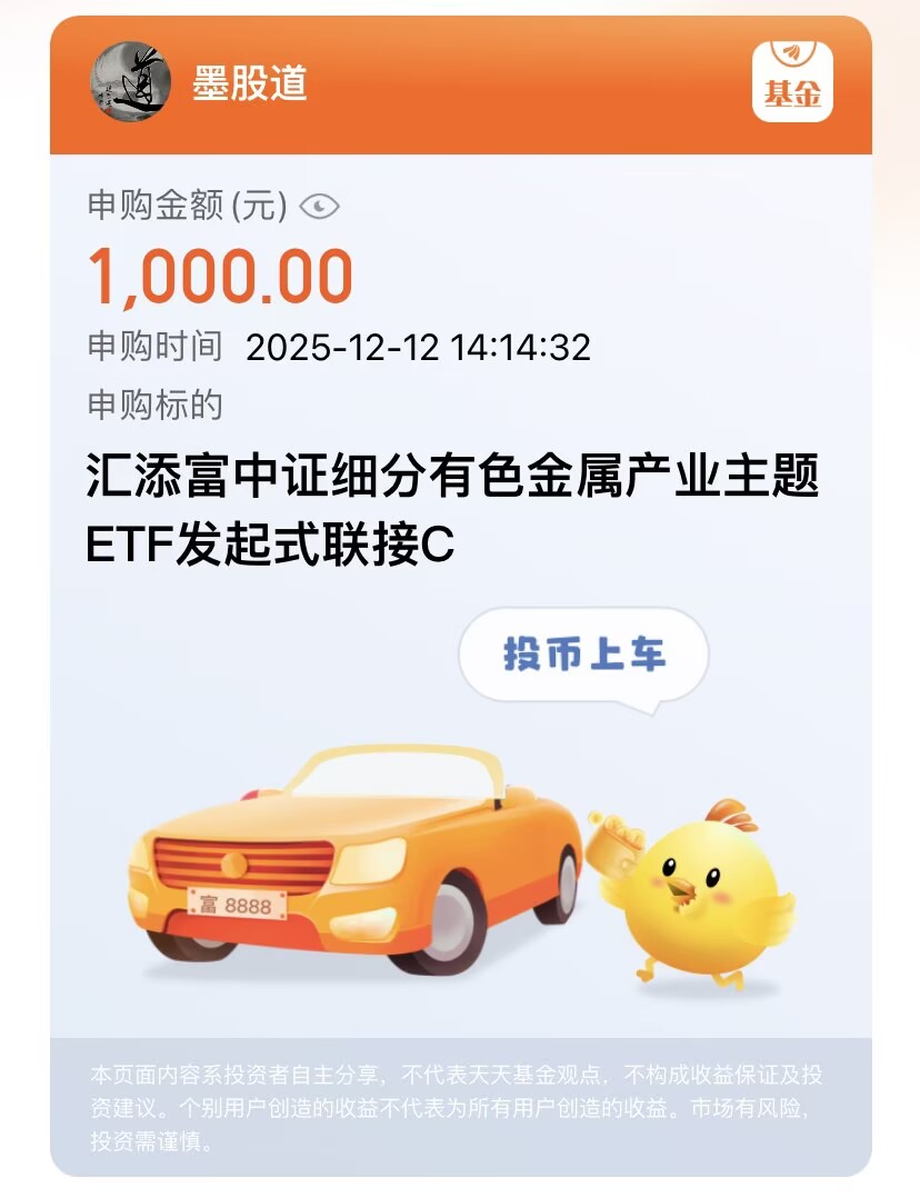 $汇添富中证细分有色金属产业主题ETF发起式联接C(OTCFUND|019165)$亮点很突出,含铜量高达30%、黄金14%,比同类有色指数占比高不少,既能沾到铜的周期红利,又有黄金的避险属性。业绩也很亮眼,近三个月涨了15.85%,近六个月更是涨了57.04%。现在趁着板块表现强势、逻辑支撑足,我继续上车,慢慢积累筹码,挺期待后期行情的。