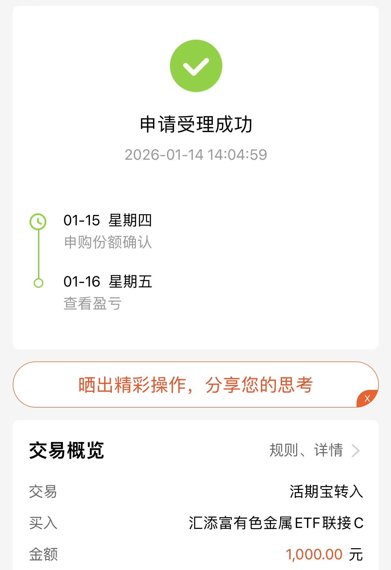 今天的市场早盘迎来了一波集体反弹,三大股指全面上涨,其中创业板指数涨幅一度超过2%,量能也温和放大,市场情绪明显回暖。这种回升趋势让我对后市更加有信心,特别是看到一些周期性板块的表现,我决定再度加仓汇添富中证有色金属C,增加了1000元的投入。