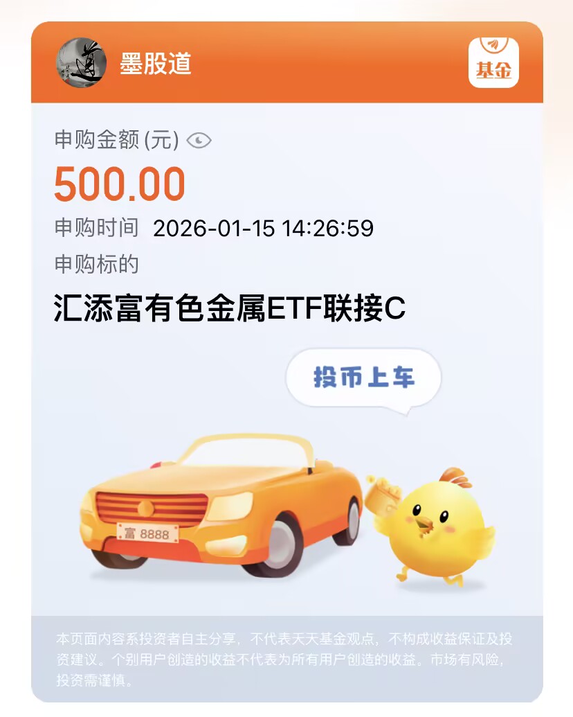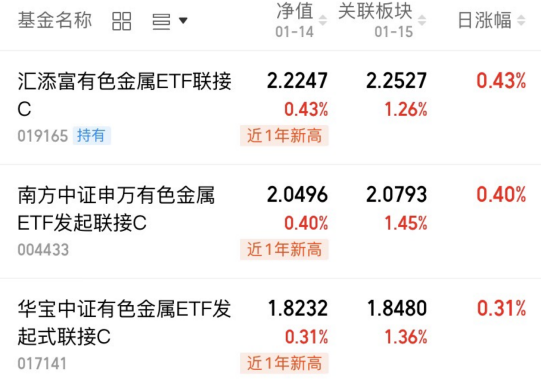 地缘政治扰动的背景下,安全溢价上行,有望推动相关商品价格重估。对比$南方中证申万有色金属ETF发起联接C(OTCFUND|004433)$和$华宝中证有色金属ETF发起式联接C(OTCFUND|017141)$之后发现,$汇添富有色金属ETF联接C(OTCFUND|019165)$亮点很突出。它的持仓里铜占比 30%、黄金占比 14%,远超同类有色指数基金,既能吃到铜的周期红利,又能享受黄金的避险福利。这只基金费率更低,7 天免赎回费,业绩也很亮眼,近三个月涨幅 21.87%、近六个月涨幅高达 77.27%。趁着板块强势、逻辑支撑也够硬,我打算继续上车慢慢攒筹码,长期看好有色板块的后续行情。