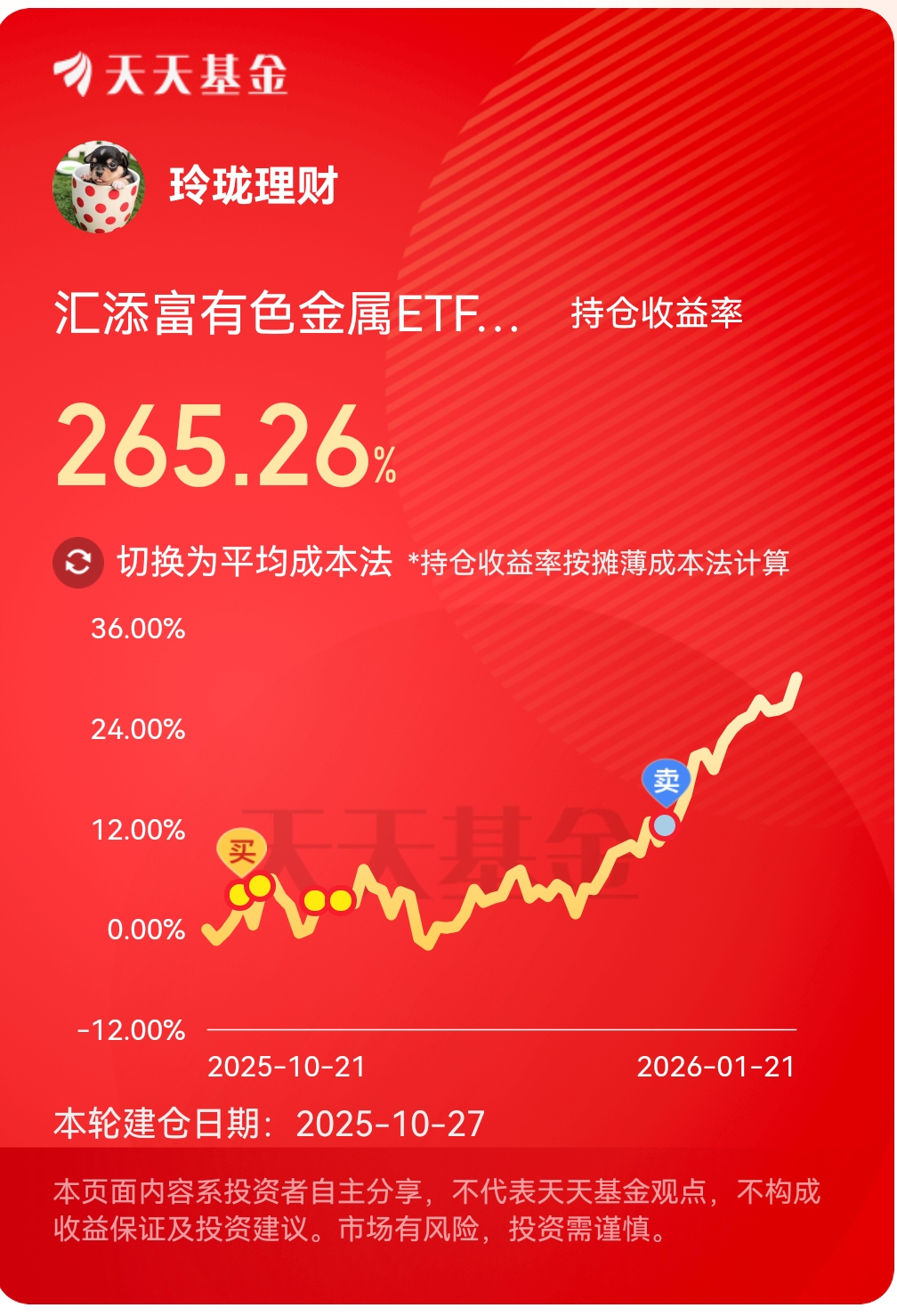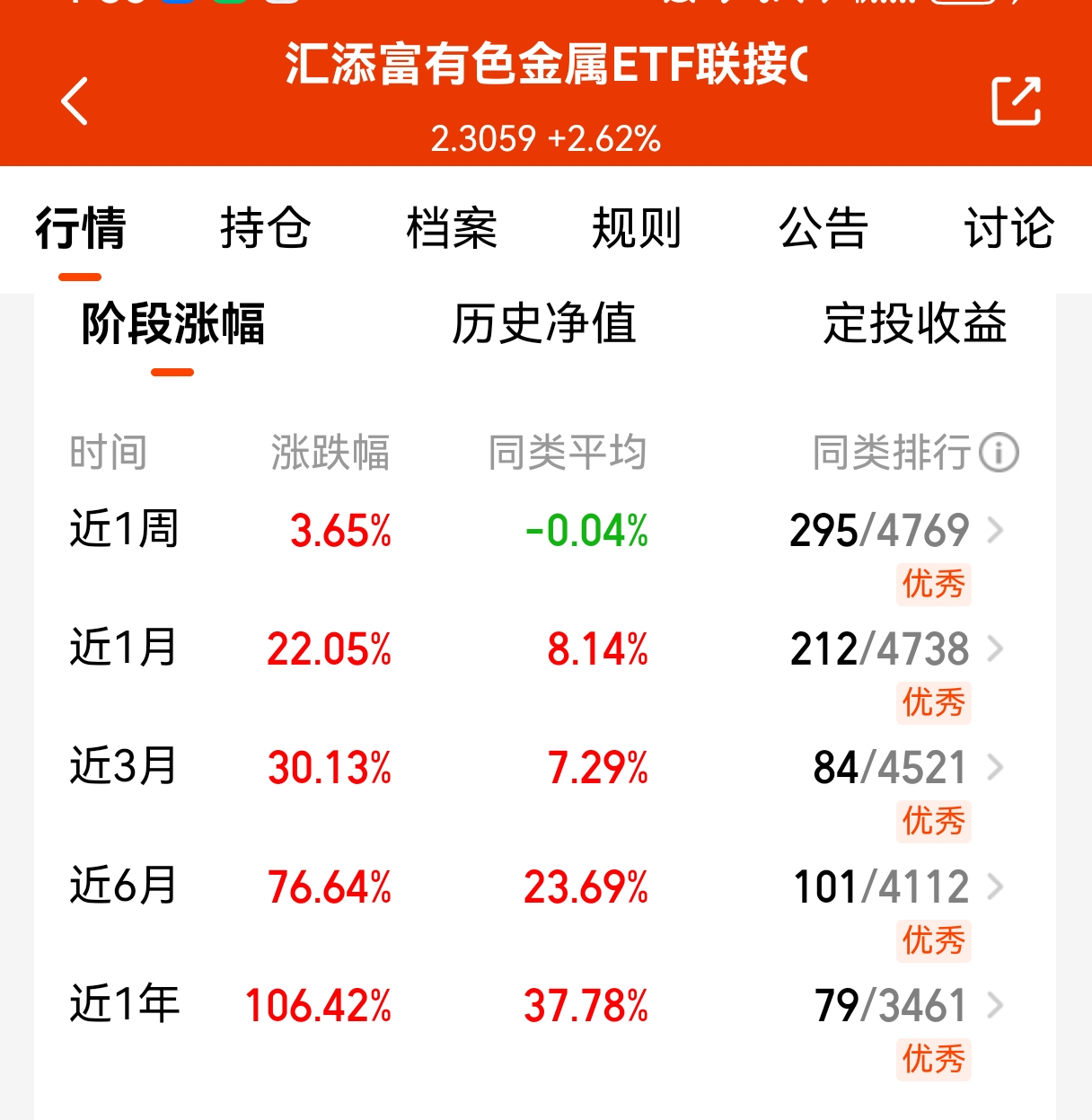 宝子们,今日大盘有所震荡,目前三大股指都绿了这个,有色板块也有所调整,这时候调整其实也是给我们机会,整体来看$汇添富有色金属ETF联接C(OTCFUND|019165)$表现还是很出色的,昨天涨幅2.62%,近一个月涨幅22.05%,近六个月涨幅76.64%,业绩很优秀。这个指数含铜量更高,含铜量30%,黄金含量也比较大,显著高于同类有色指数,全面覆盖工业金属、贵金属、能源金属三大高景气赛道,叠加AI数据中心新增需求,现在白银限购,配置有色是可以的,而且这个C类份额,7天免赎回,操作起来灵活性也很高。