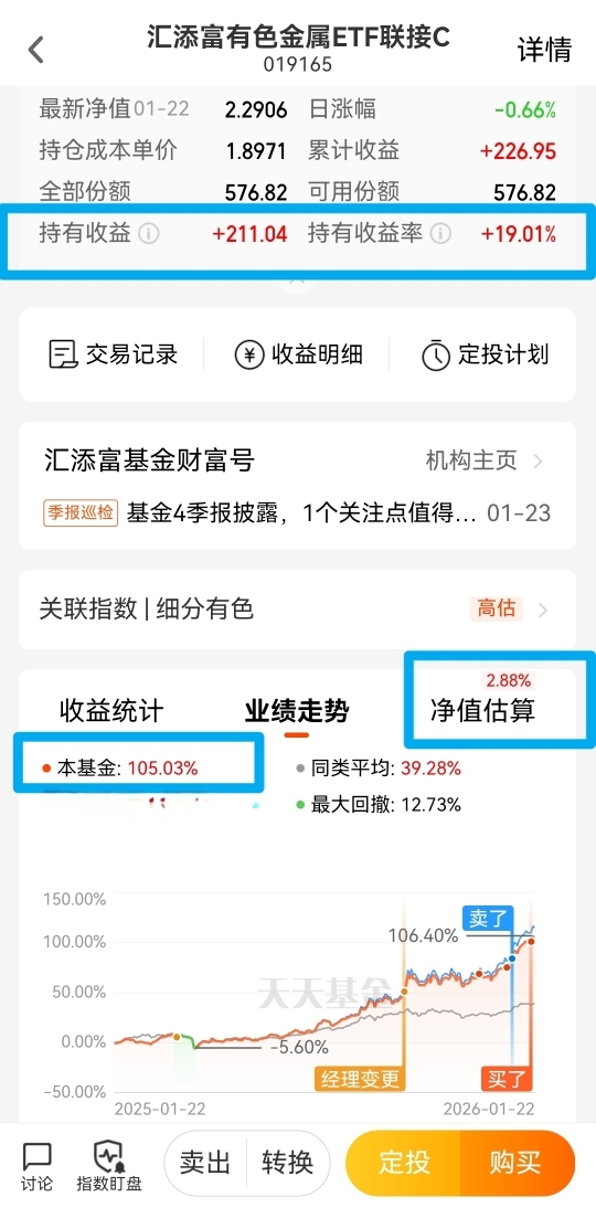 $汇添富有色金属ETF联接C$ 紧密跟踪细分有色指数,深度参与有色金属行业周期,近1年指数涨幅达114.99%,行业贝塔效应显著。个人持有收益率19.01%,今天实时大涨2.88%,又是吃肉的一天,7天免赎回,操作灵活,体验感相当不错!