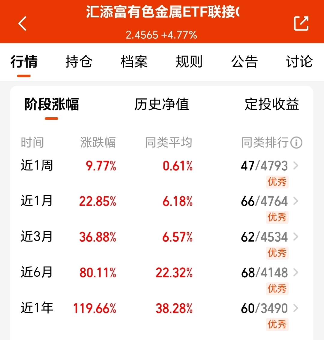 黄金已经冲破5000美元,白银限购升温,有色金属的行情或许正当时!在把握这波有色金属机会上,我认为$汇添富有色金属ETF联接C$ 是优选,尤其是它在金铜双主线布局上优势相对要突出很多。