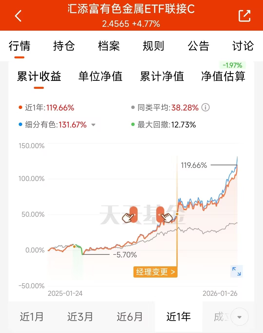 对比南方有色和华宝有色之后,我发现$汇添富有色金属ETF联接C(OTCFUND|019165)$亮点特别突出。它的持仓里铜占比 30%、黄金占比 14%,这个比例远超同类有色指数基金,既能吃到铜的周期红利,又能享受黄金的避险福利。而且这只基金费率更低,还有 7 天免赎回费的优势,业绩更是亮眼,近三个月涨幅达到 36.88%、近六个月涨幅高达 80.11%。现在有色板块走势强势,背后的逻辑支撑也够硬,我打算继续上车慢慢攒筹码,长期看好有色板块的后续行情。