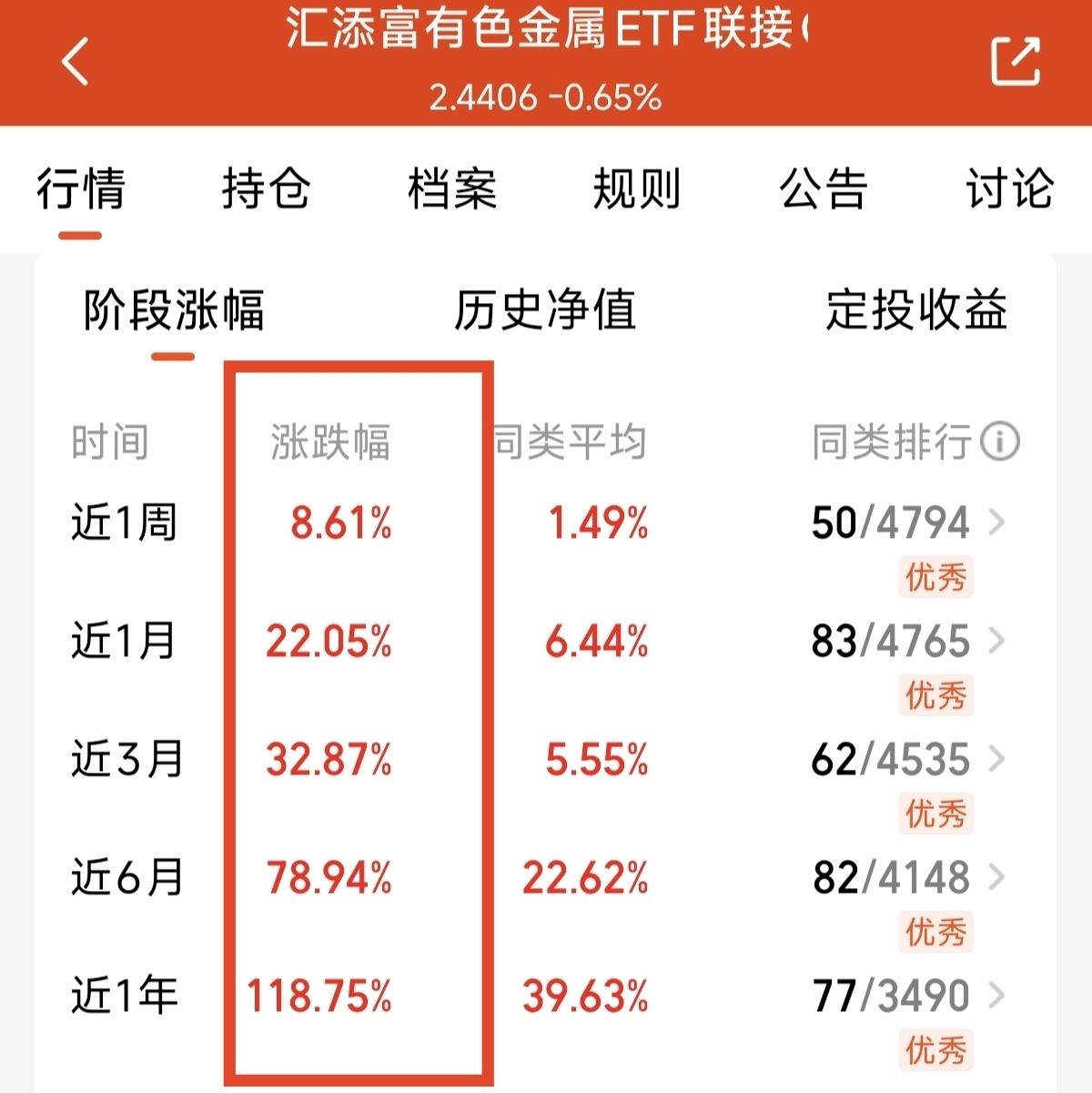 $汇添富有色金属ETF联接C$ 这是聚焦有色金属的指数基金。紧密跟踪中证细分有色金属指数。指数中铜权重持仓34%,金权重12%,在同类指数占比领先,全面覆盖金、铜、铝、锂、稀土等有色金属产业链,持仓全部是各细分行业的优质龙头。基金跟踪指数误差小,近一年涨幅118.75%,大幅跑赢黄金涨幅的同时,也是跑赢了其他有色金属指数基金的涨幅,而且C类免申购费,持有7天免赎回费,综合成本也是比较低,今天的估值已经涨超四个点,有望再度创出新高。