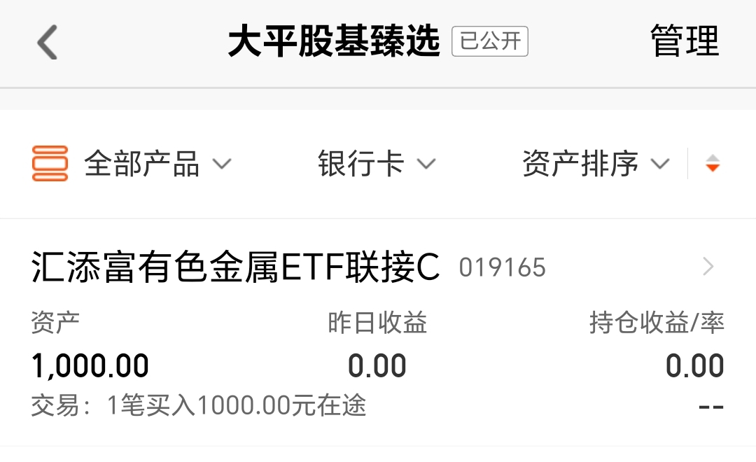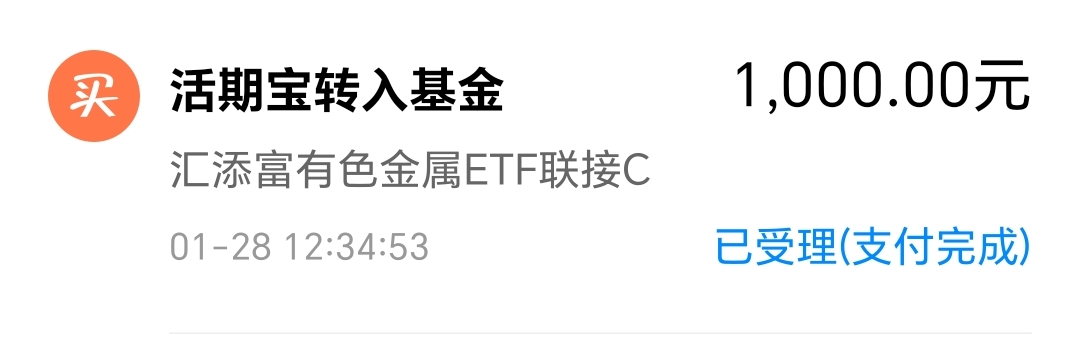 今天我买入$汇添富有色金属ETF联接C(OTCFUND|019165)$1000块钱。