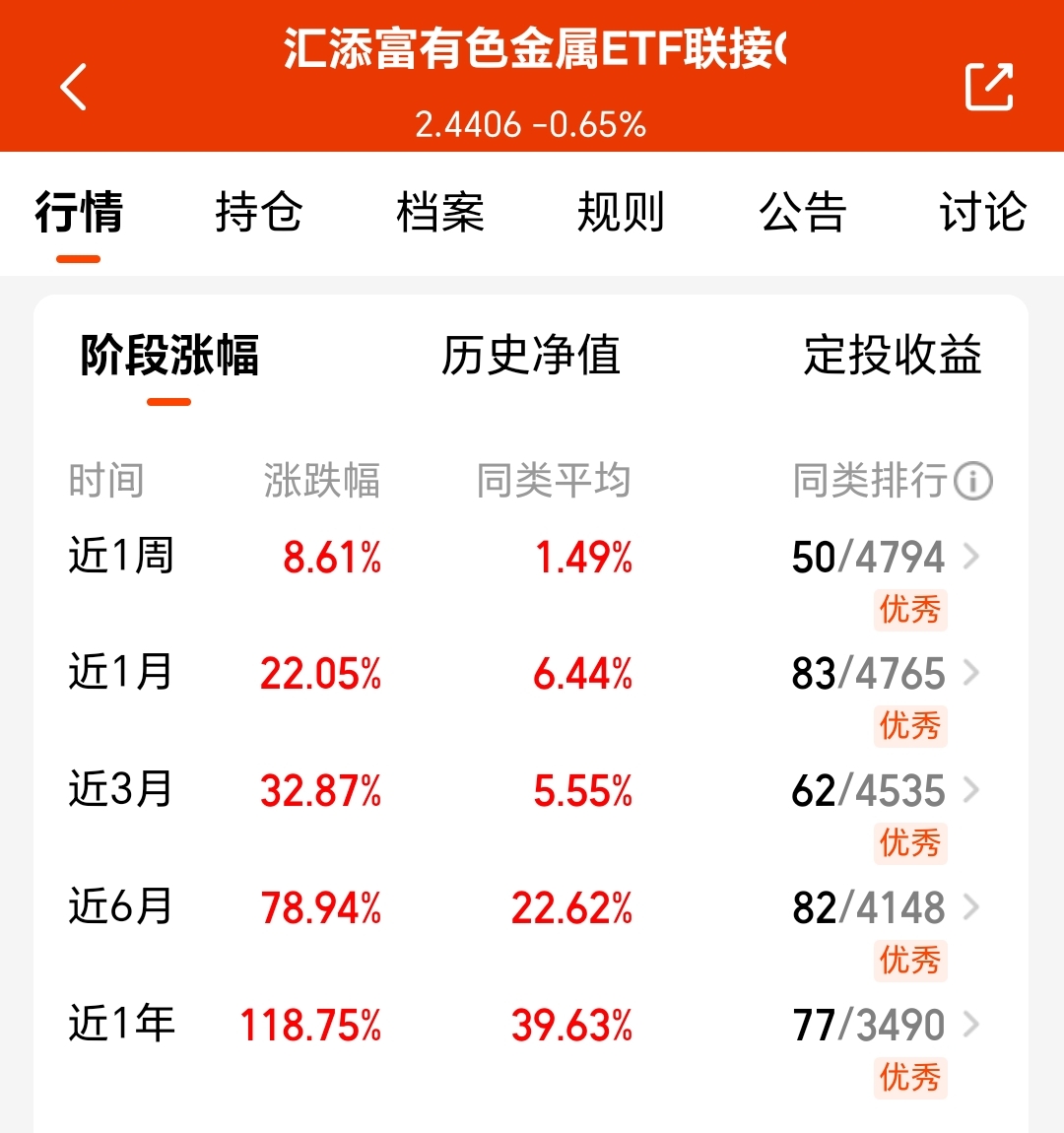 这只基金跟踪的指数全面覆盖金、铜、铝、锂、稀土等核心子板块,聚焦有战略价值和供需缺口的核心品种,它的金铜含量合计46%更是同类领先,因此也收获了漂亮的业绩,该基金近1年涨近119%,近2年涨幅超153%,大幅领先同类平均。而且C份额还是7天免手续费赎回。