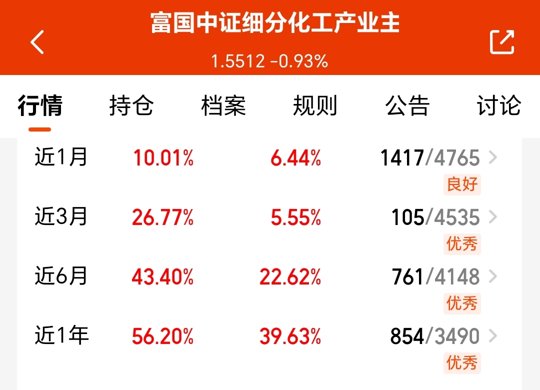 今天细分化工板块太给力了,早盘收出实体阳线,一度涨超2.7%!我持有的这个基金也跟着发力,目前我盈利已超5%了,它近6个月涨了43.4%,近1年涨了56.2%,还是很优秀的。
