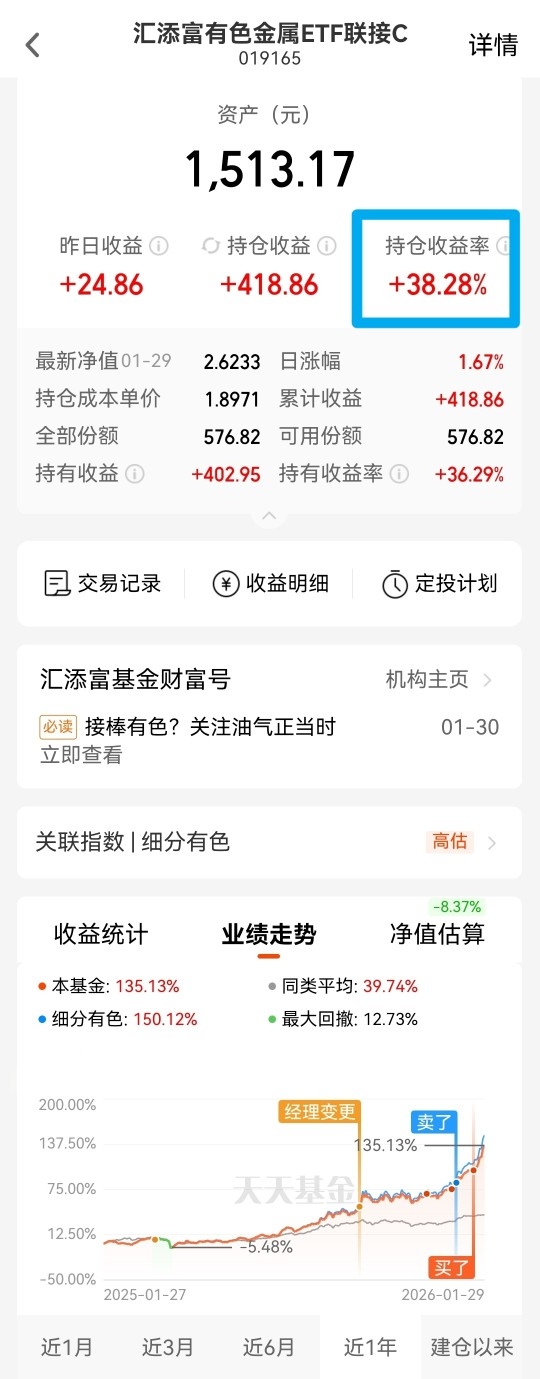 止盈扰动,引发有色板块技术性调整,但上涨逻辑仍在,还在为中期选举努力,这世界还会被他搞得鸡犬不宁。不论是避险属性的贵金属(如黄金),还是工业金属(铜)、能源金属(如锂),这几个细分有色金属领域,在电网、锂电、资源等领域都颇有机会。 我的$汇添富有色金属ETF联接C$ 持有收益率38.28%,只要你肉垫够厚,你的信仰会更强烈,期间的波动就心如止水。这只基金是7天免赎回,申赎操作方便。而且含铜量30%,黄金含量14%,显著高于同类有色指数。受有色板块铜铝供应紧缺、降息预期以及黄金的韧性支撑,继续贯彻持仓待涨和逢低加仓的策略。#白银一度跌超8% 贵金属巨震是何信号?# #4200点久攻不下 盘整十日何去何从?# #煤飞色舞!资源机会来了?#