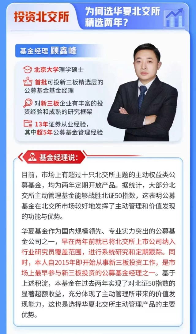 近3年业绩同类第一,$华夏北交所精选两年定开混合发起式$基金经理是首批磕头新三板精选层的,有新三板工作经验,对北交所研究更加深刻,开放期入手了,对他太放心了