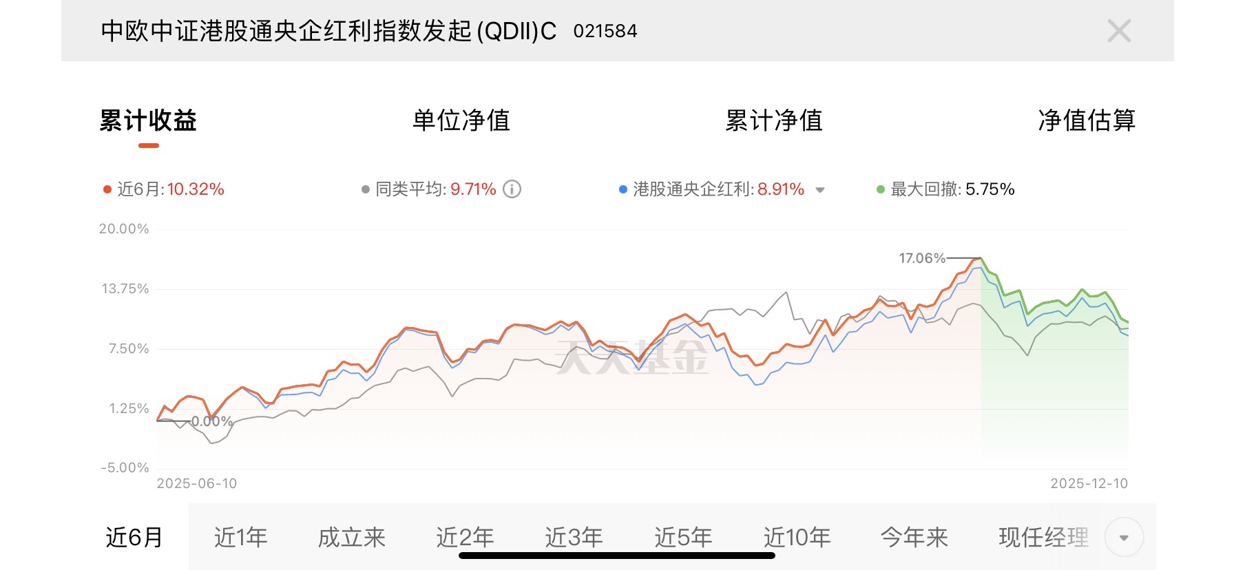 中信证券明确说 Q4 是布局红利资产的关键期,错过可能就没超额收益了。中欧中证港股通央企红利指数发起 (QDII) C 近 6 个月 10.32%,短期抓紧上车,别等涨了再后悔。