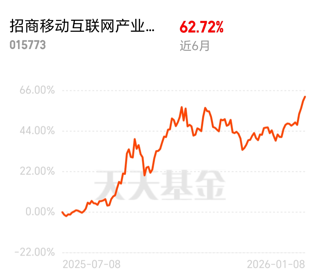 移动互联网指数近期止跌反弹,板块景气度持续向好。$招商移动互联网产业股票基金C$ 近 6 月斩获 62.72% 高收益,连涨 4 天没掉队,昨天 1.46% 的涨幅再添动力,投资更安心。