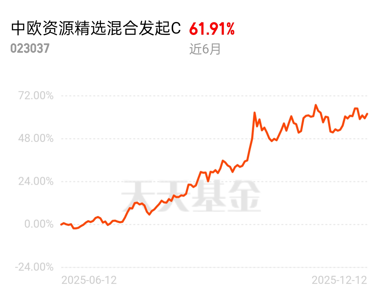 美联储降息让非生息资产更吃香,黄金等贵金属成资金避风港。中欧资源精选混合发起 C 近 6 月 61.91%,多区间表现稳,短期长期都能打。$中欧资源精选混合发起C$