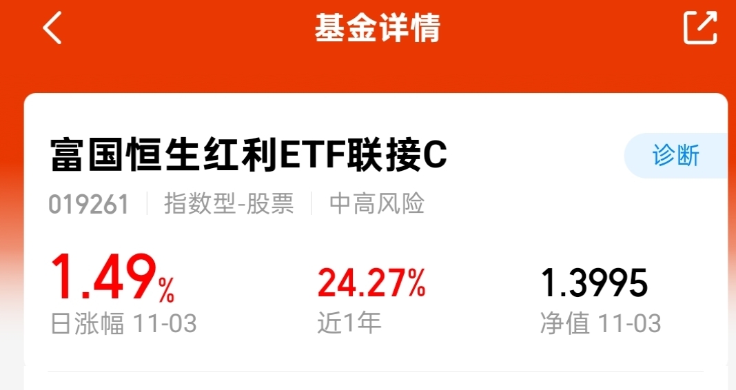 近期市场多震荡,扎心了,就想着物色点稳当点的产品,吃颗定心丸先,发现$富国恒生红利ETF联接C$ 不错,费率低有七免,它精准跟踪恒生港股通高股息低波动指数,网罗港股高分红核心资产,昨天涨幅1.49%近一年涨幅24.27%很不错了呀,当前美联储降息预期升温,美债利率下行将进一步改善港股流动性,为板块添动力,今天买个2000揣兜里了。