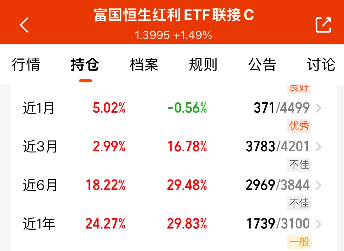 今日,红利指数再度反弹上涨,再追一份$富国恒生红利ETF联接C$ ,近六个月超18%的涨幅也是同类中比较能涨的,同期中证红利等指数近六月涨幅几乎不到10%,超额不少的,另一方面,美联储如期降息,对于处在估值洼地的港股央企而言也将吸引更多外资布局,有助于提升估值修复动力,符合也是长线资金的胃口, 除非有新的热点主线冒出来,不然短期内,市场还是有回调压力,所以我认为红利指数还会有所表现。