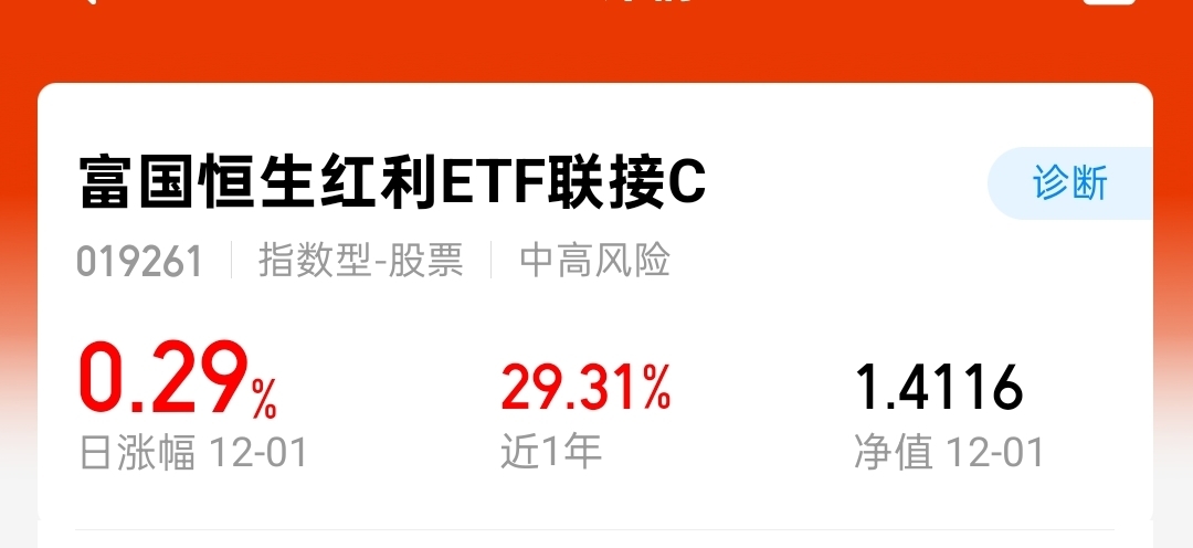 $富国恒生红利ETF联接C$ 跟踪恒生港股通高股息低波动指数,聚焦高分红,低波动标的,整体走势很稳,抗跌能力也比较强,今天继续加点放兜里作压舱石了。