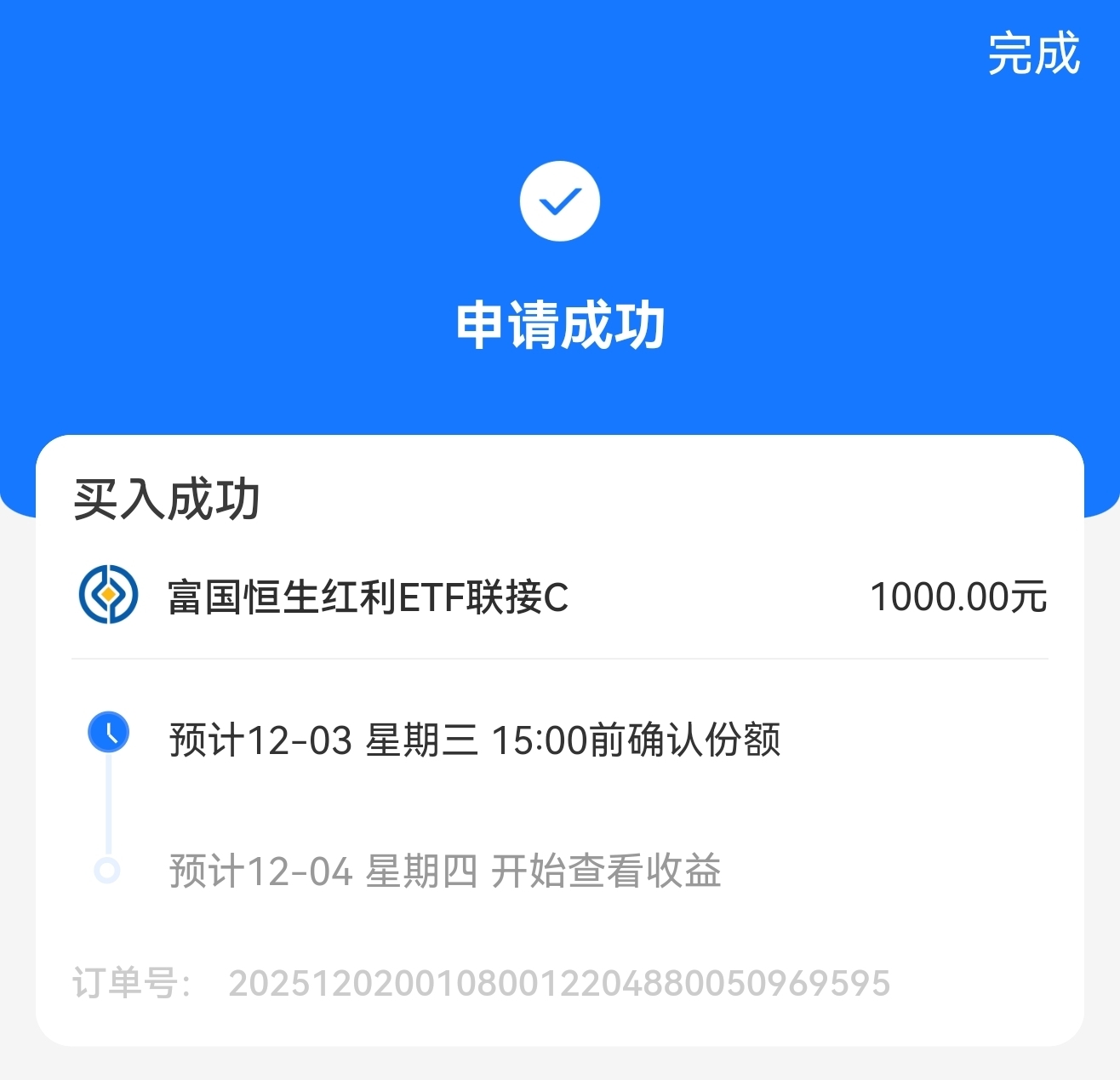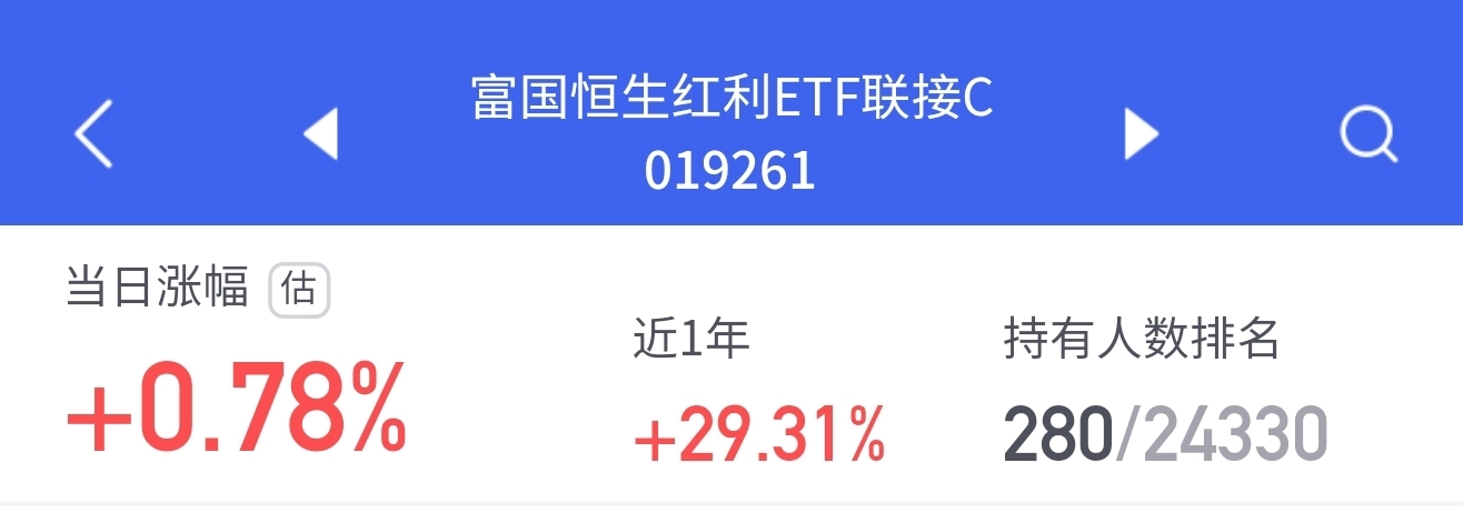 在此震荡行情下,港股红利板块表现优秀,$富国恒生红利ETF联接C$ 展现出强劲的业绩韧性,近半年涨幅达13.54%,近一年涨幅更是29.31%,且保持每月分红的稳定优势。该板块多呈现下跌后连涨的态势,11月以来在市场震荡期间,表现显著跑赢恒科板块,抗跌性好。今天我加仓计划中长期持有,期待后续吃肉了。